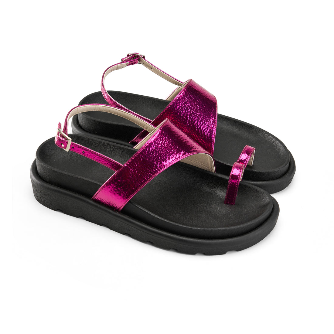 Elevate your footwear collection with these Toe-Loop Ankle Strap Sandals in a rich purple hue....