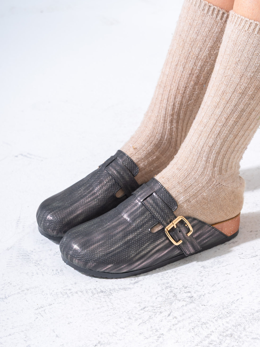 Snake-Embossed Buckle Clogs combine practical comfort with distinctive style. Featuring a striking embossed snake texture...