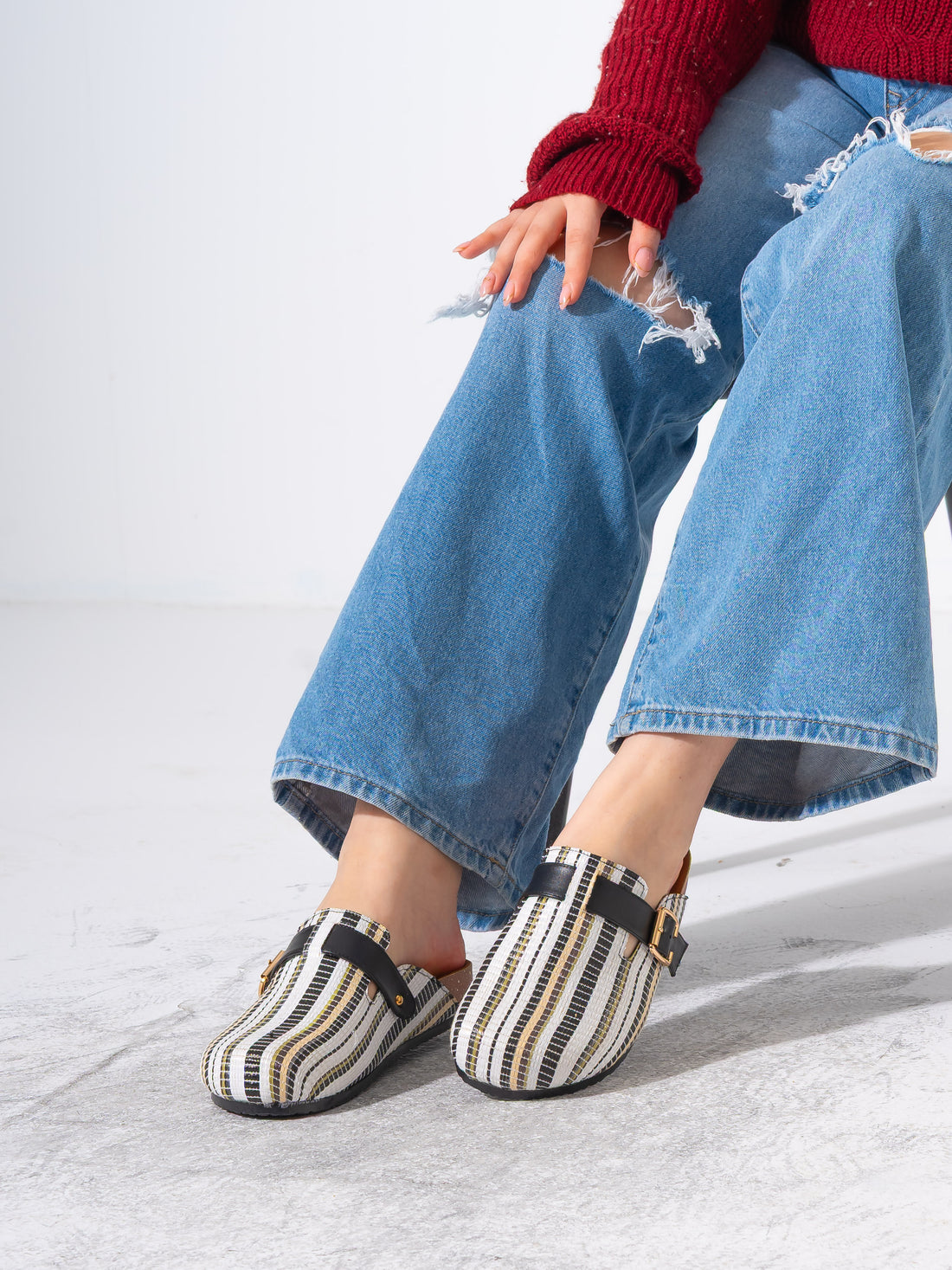 Striped Woven Fabric Buckle Clogs - BEIGE