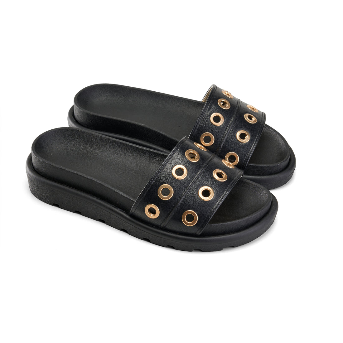 Elevate your comfort with the Grommet Detail Double Strap Slipper in black. Designed with dual...