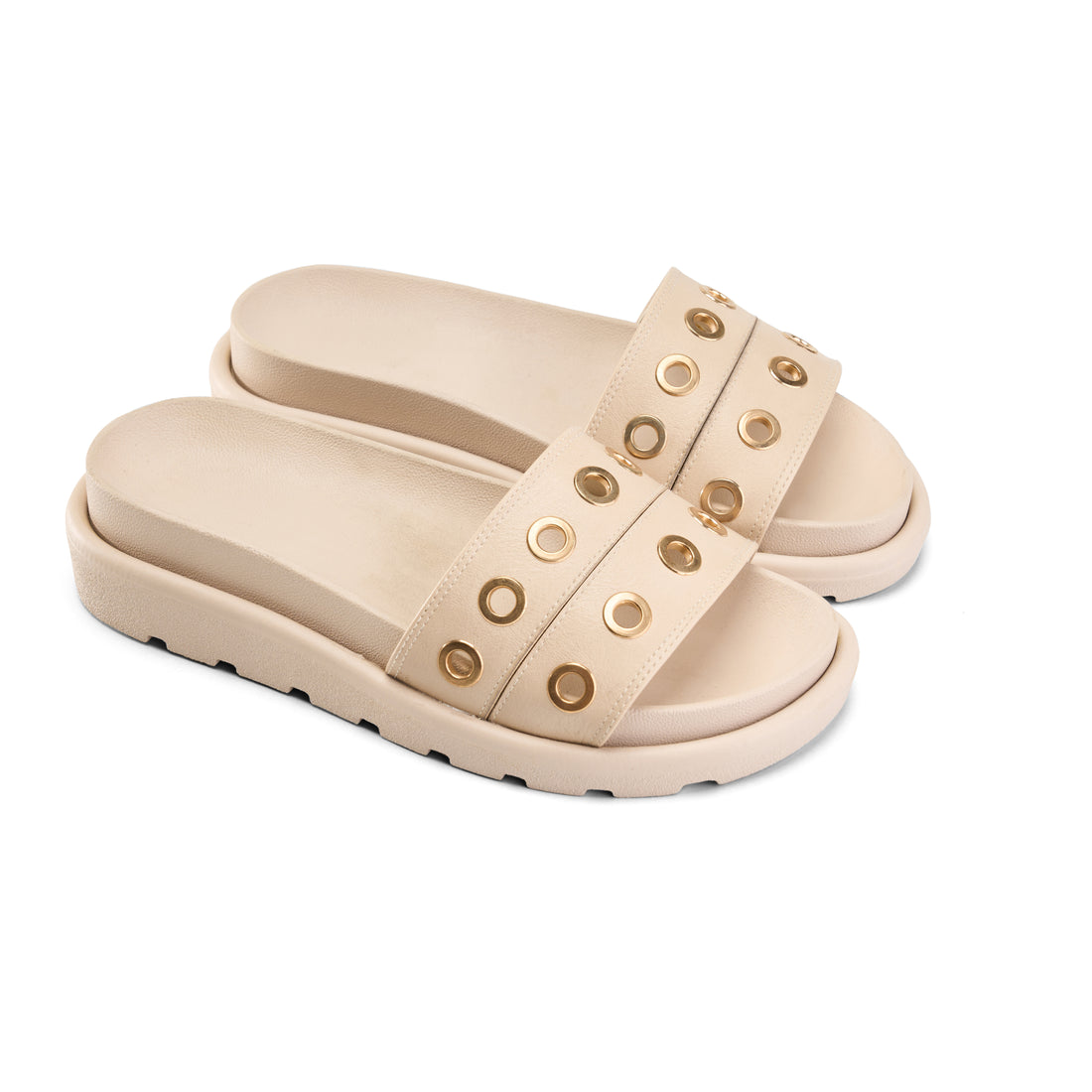 Elevate your comfort with the Grommet Detail Double Strap Slipper in beige. Expertly designed, this...