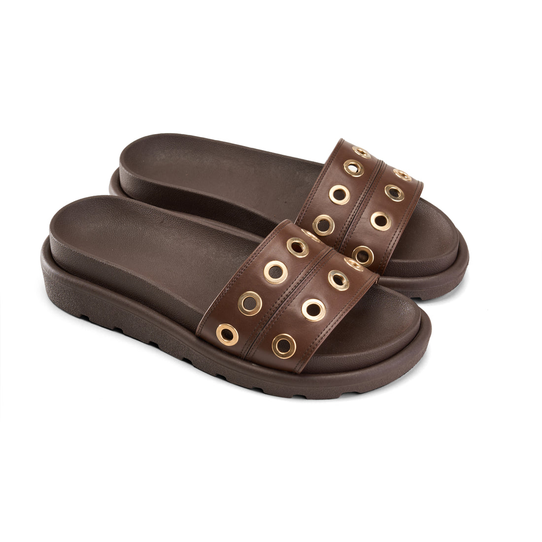 Elevate your comfort with the Grommet Detail Double Strap Slipper in brown. Designed with dual...