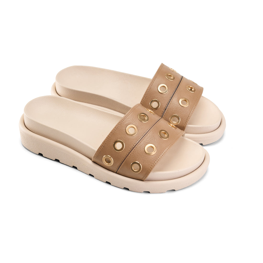 Elevate your comfort with the Grommet Detail Double Strap Slipper in Cafe. Expertly designed, this...