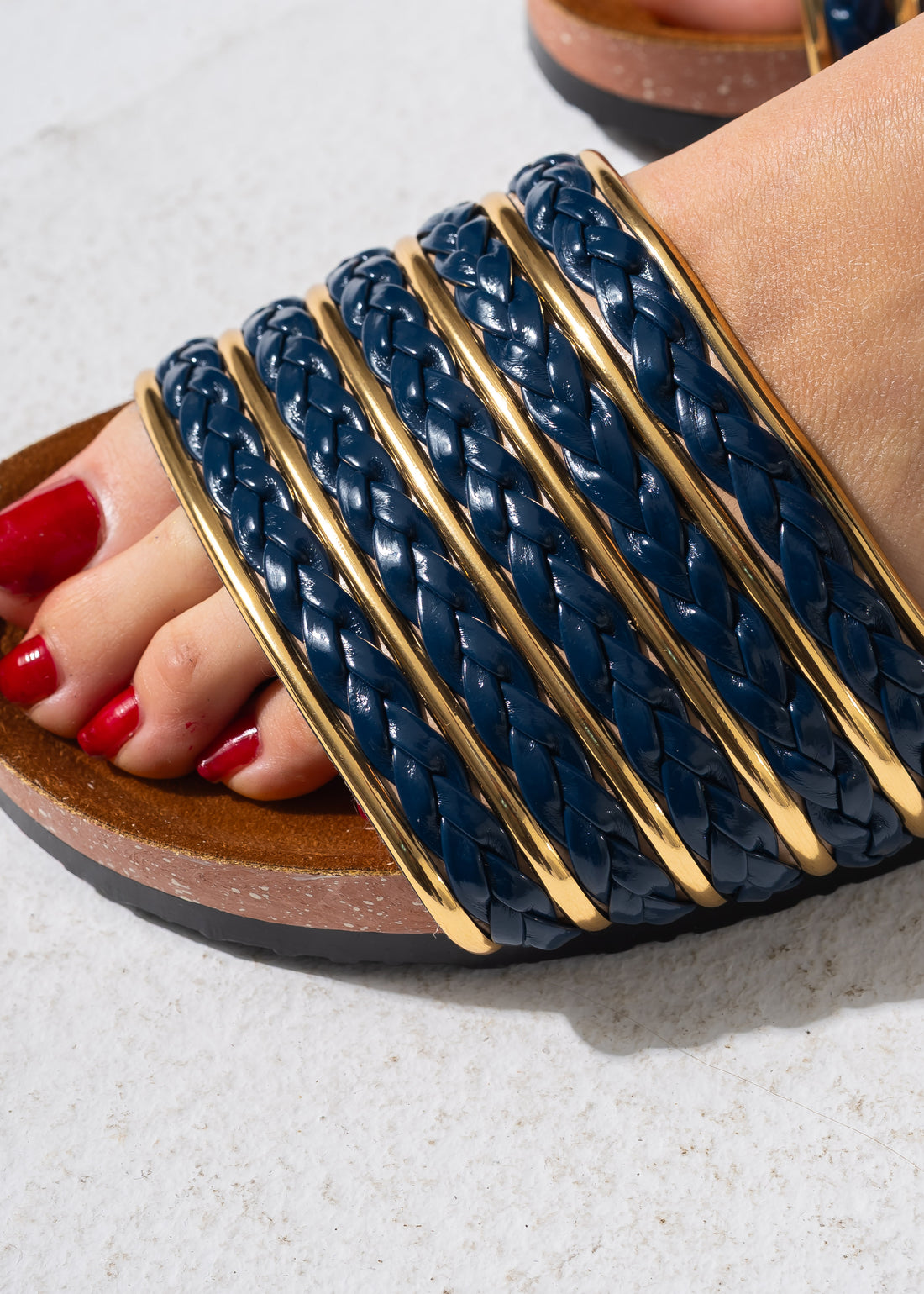 Step into style with these unique slides, featuring a mixed-media strap that blends traditional ethnic...
