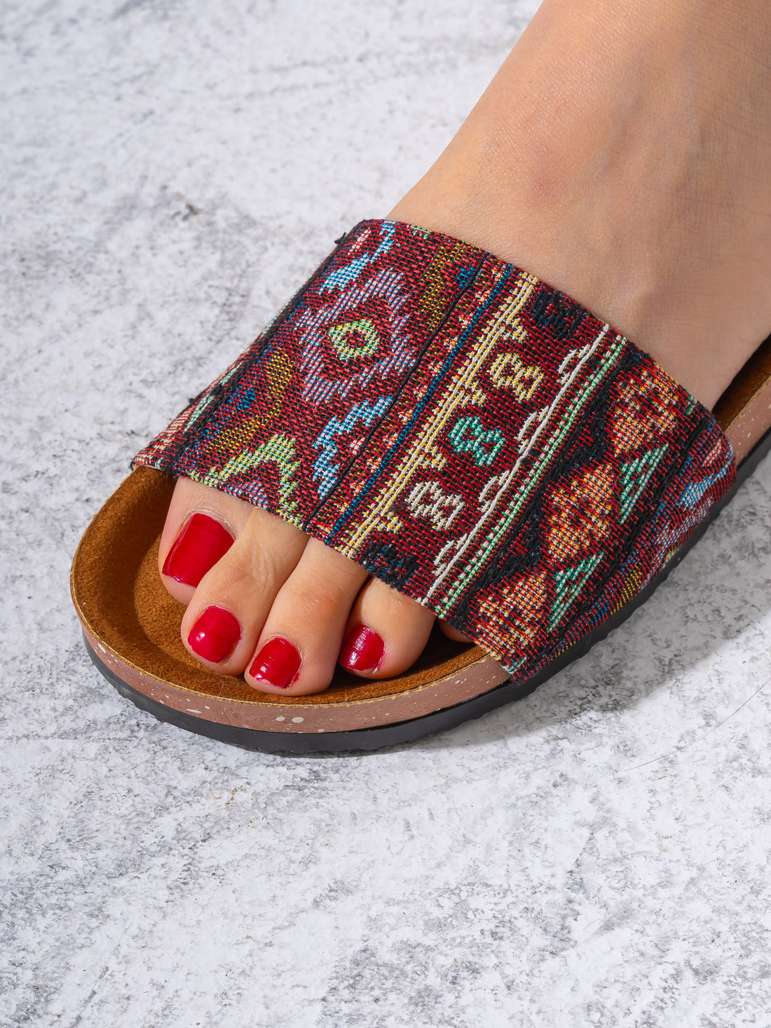 Elevate your casual look with these chic slides featuring a vibrant ethnic-inspired textile upper, beautifully...