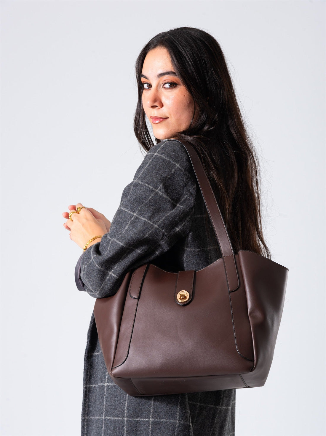 Crafted with precision, this minimal turn closure bag in rich brown leather delivers understated elegance...