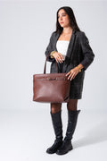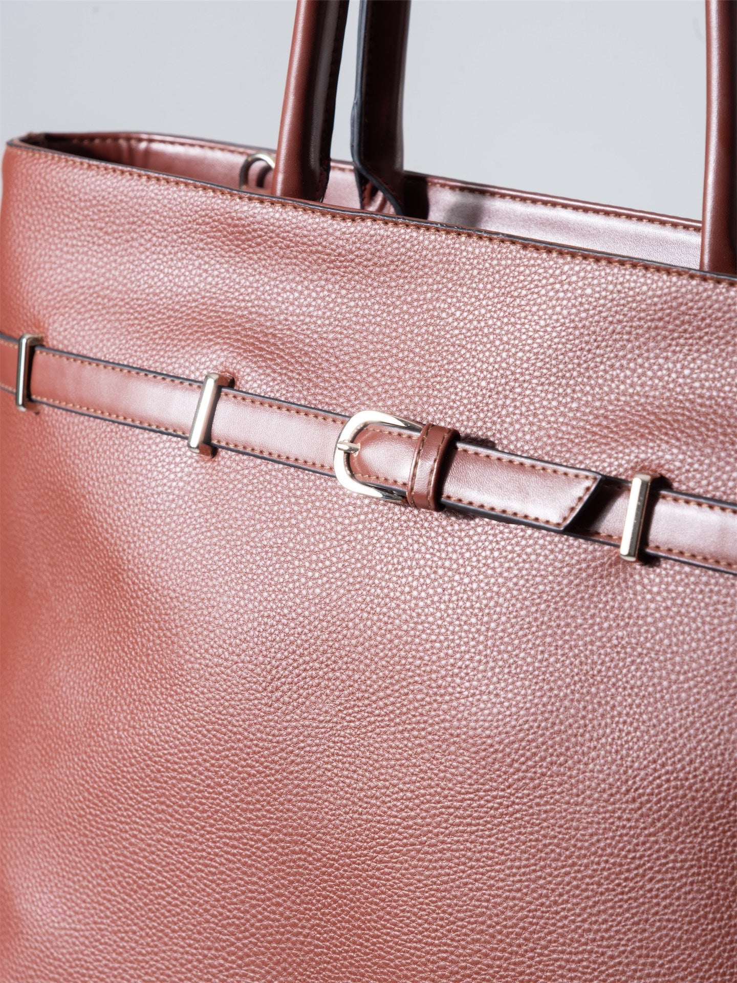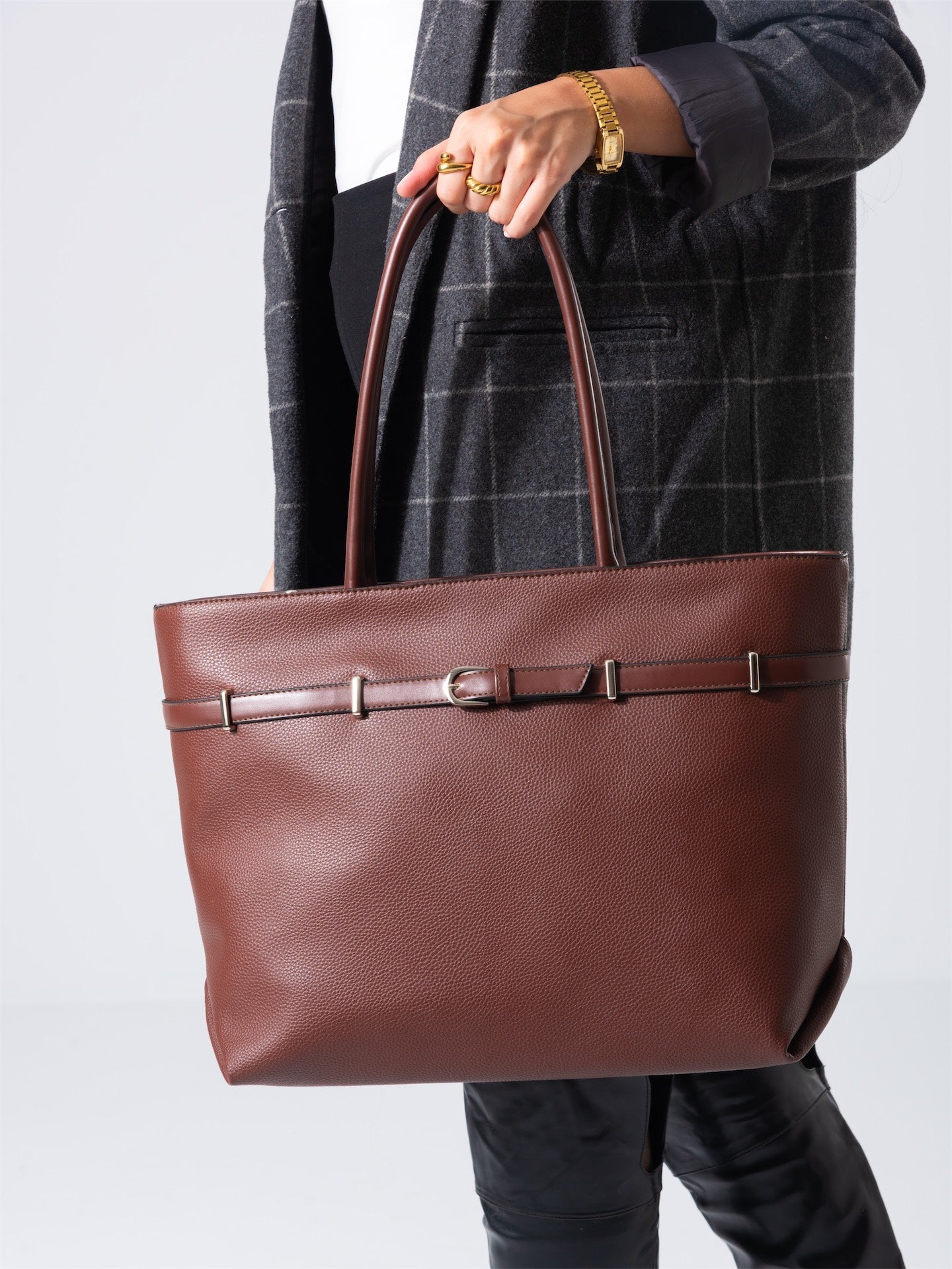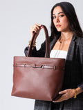 Crafted from premium materials, this classic tote combines timeless elegance with practical functionality. The distinctive belt detail adds a sophisticated touch, elevating any ensemble from casual to refined. Spacious interior accommodates daily essentials while maintaining a structured silhouette. The rich brown tone pairs effortlessly with any wardrobe, making it an indispensable accessory for the discerning professional. Durable construction ensures lasting quality and enduring style.
