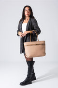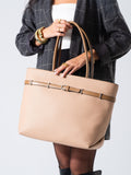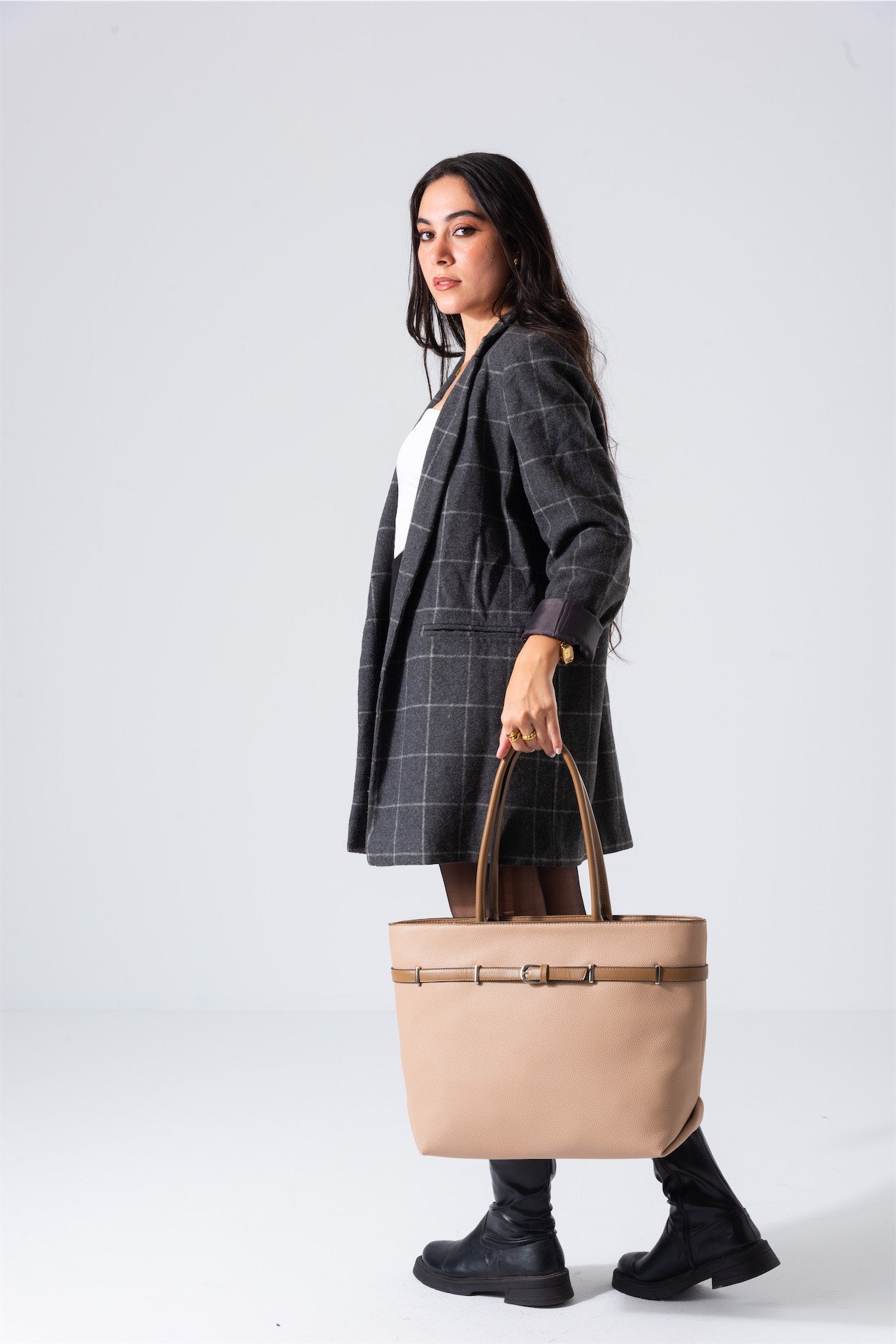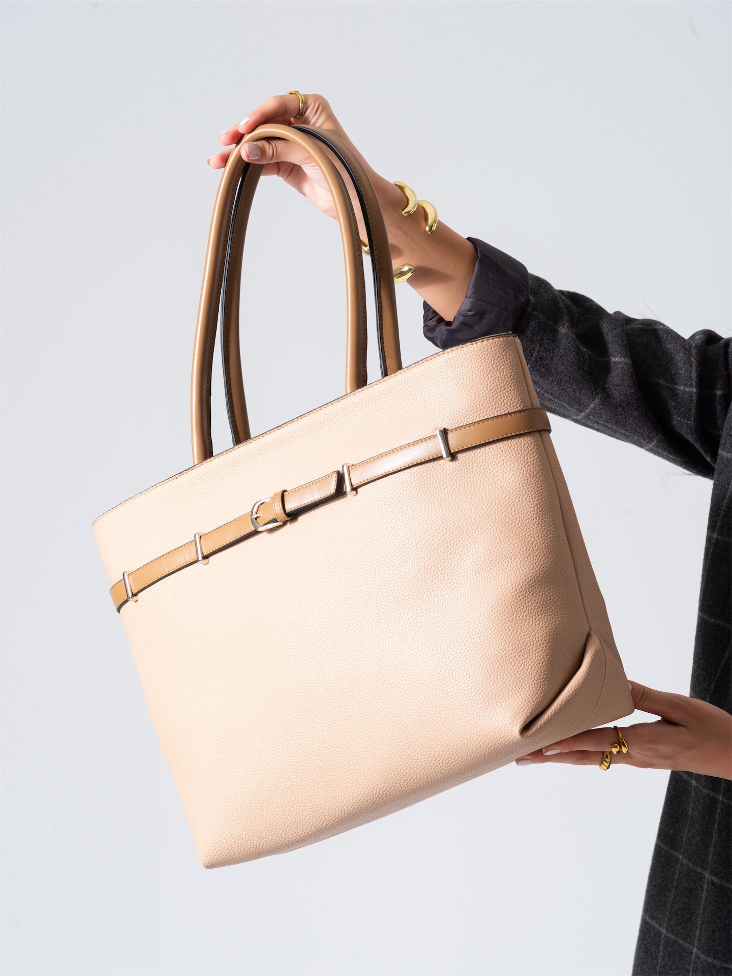 Classic Belt Detail Tote in warm café tones combines timeless sophistication with practical functionality. This structured tote features distinctive belt detailing that elevates its silhouette, making it equally suited for professional settings or weekend outings. Crafted with attention to detail, the design offers ample interior space while maintaining a refined aesthetic. The neutral café palette ensures versatile styling with any wardrobe, while quality construction promises durability through seasons of regular use. An essential accessory for those who appreciate understated elegance and reliable everyday carry.