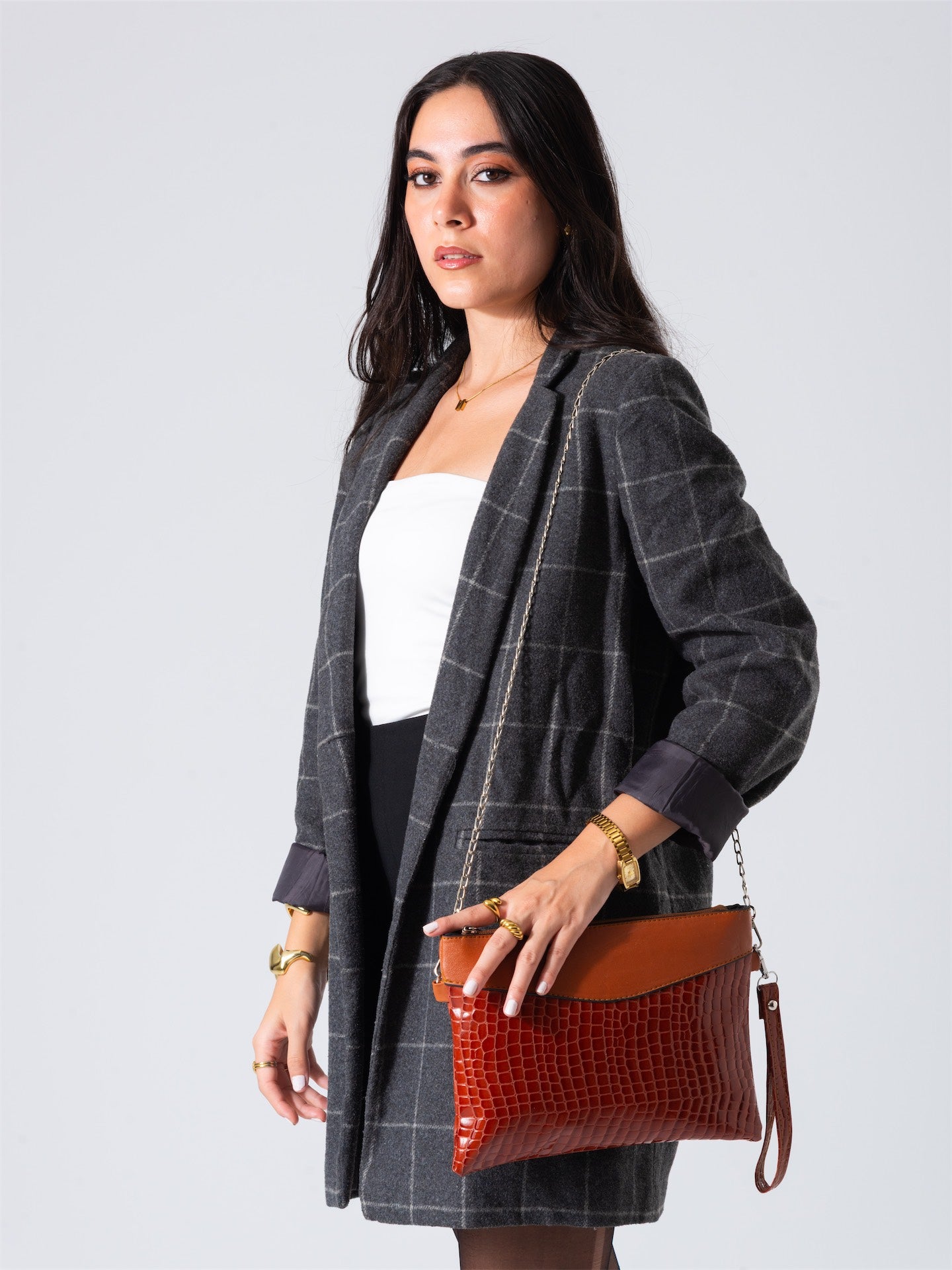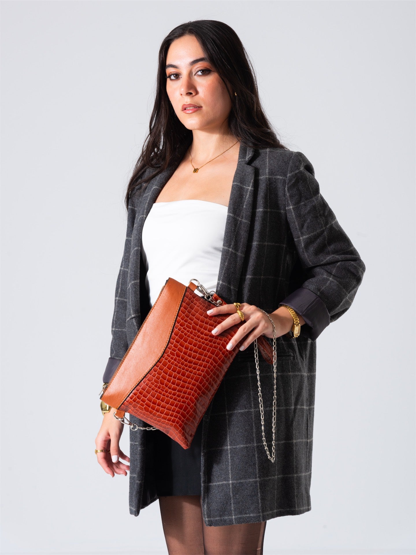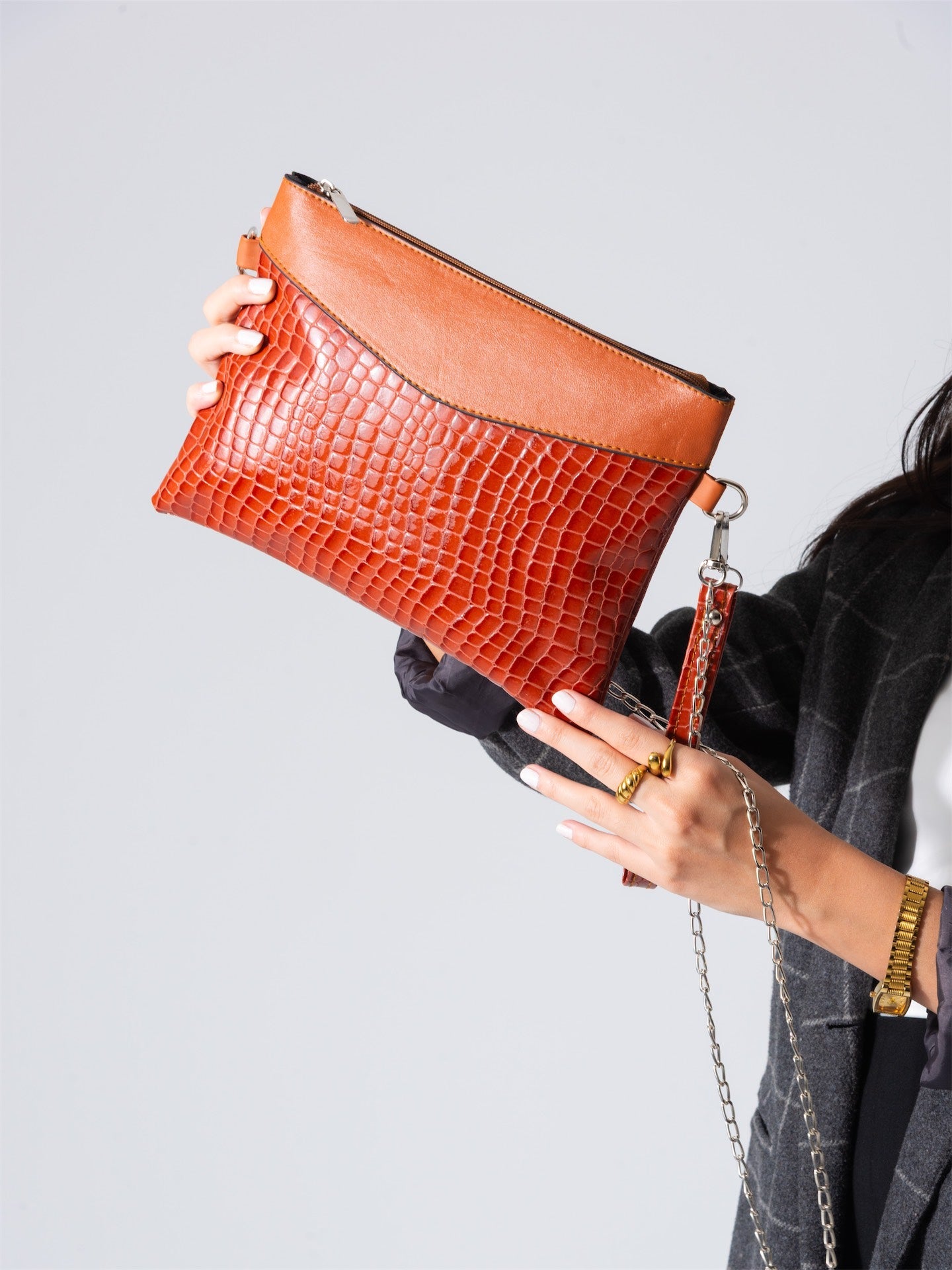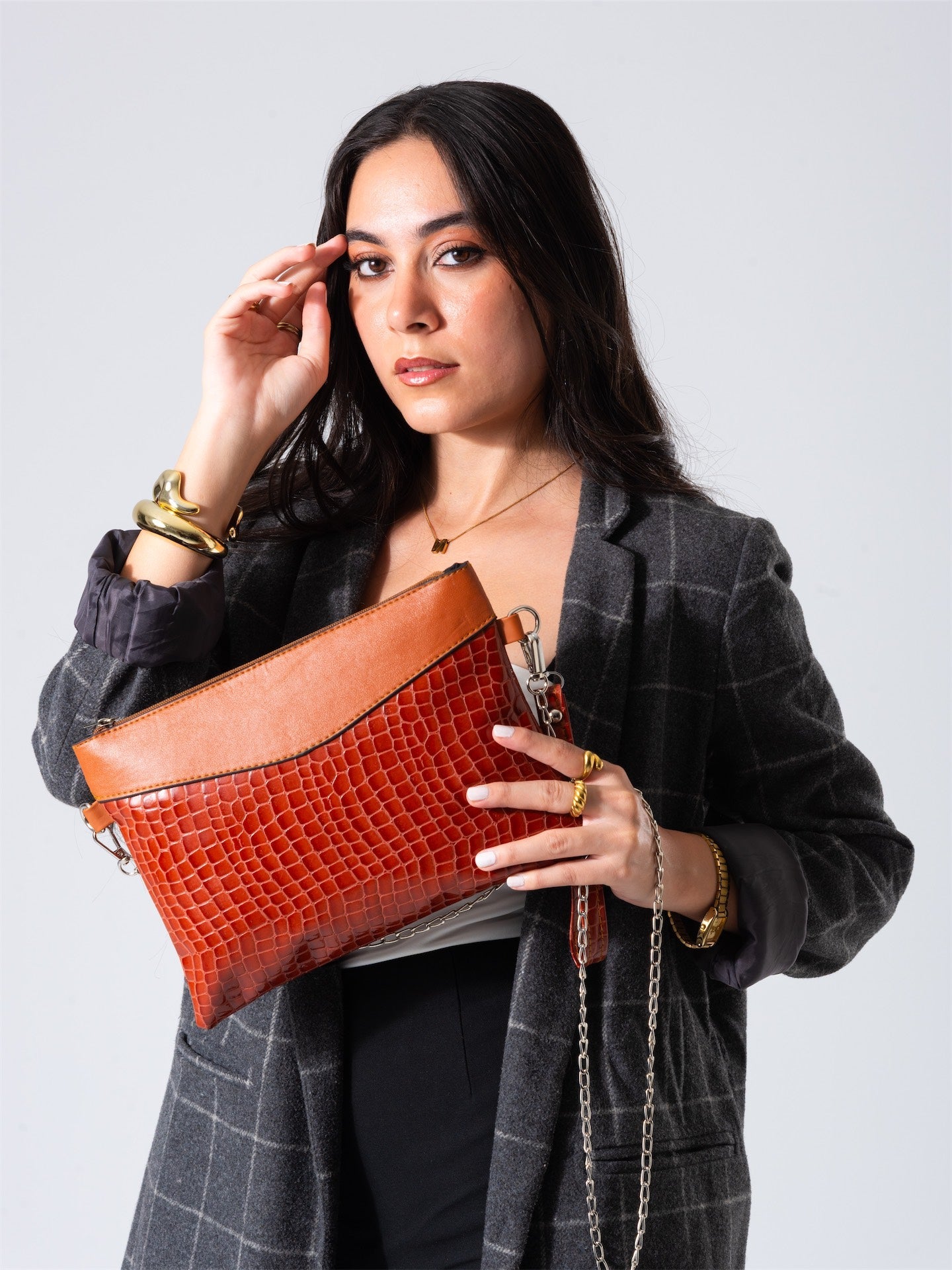 Elevate your everyday carry with this sophisticated crocodile-textured clutch in warm camel tones. Crafted with meticulous attention to detail, the embossed croco pattern adds contemporary edge while maintaining timeless elegance. Perfect for transitioning from day to evening, this versatile piece complements both casual and formal wardrobes. The structured silhouette ensures durability and shape retention, while the neutral camel hue pairs effortlessly with any color palette. An essential accessory for the discerning individual who values both style and substance.
