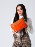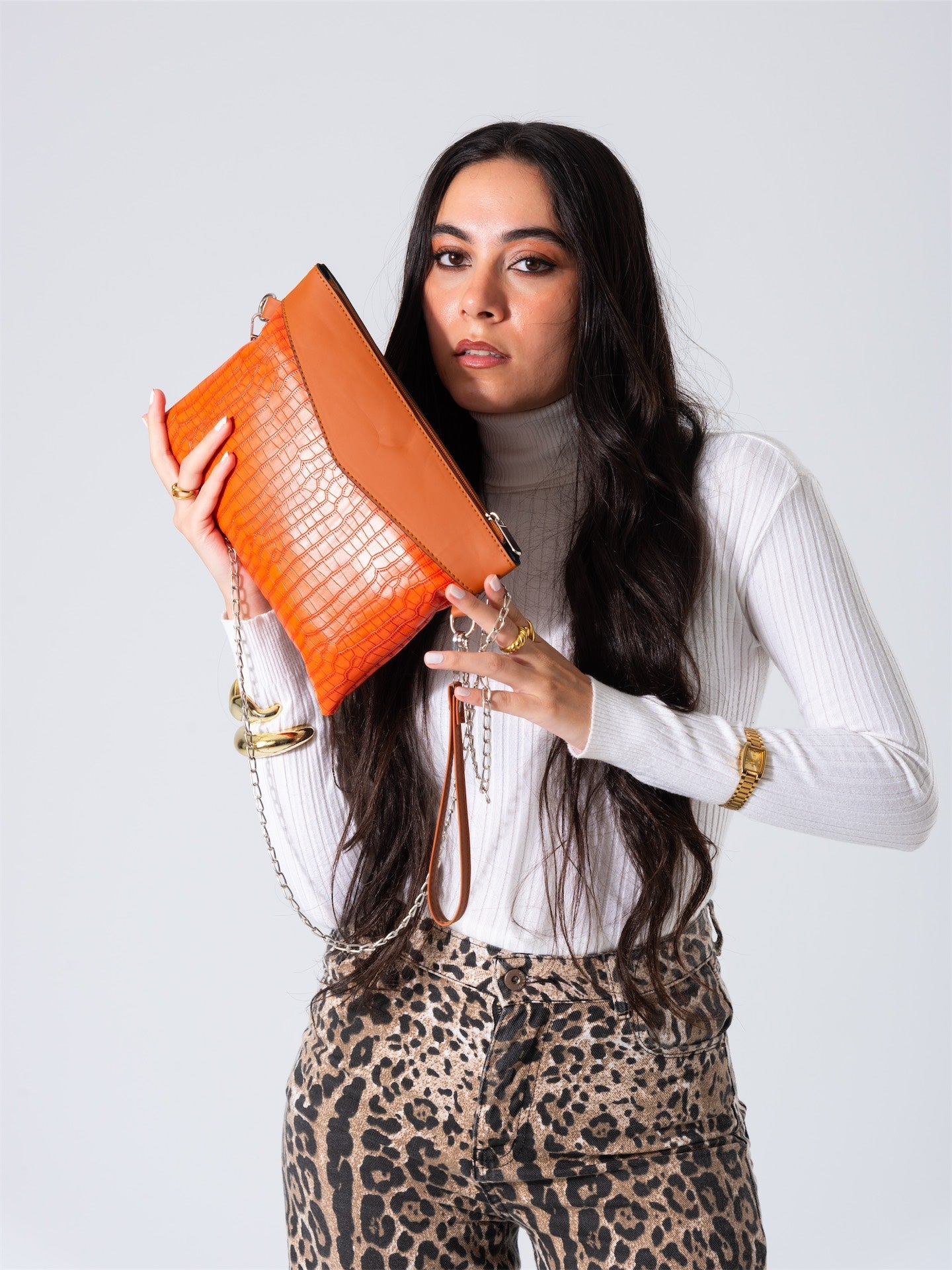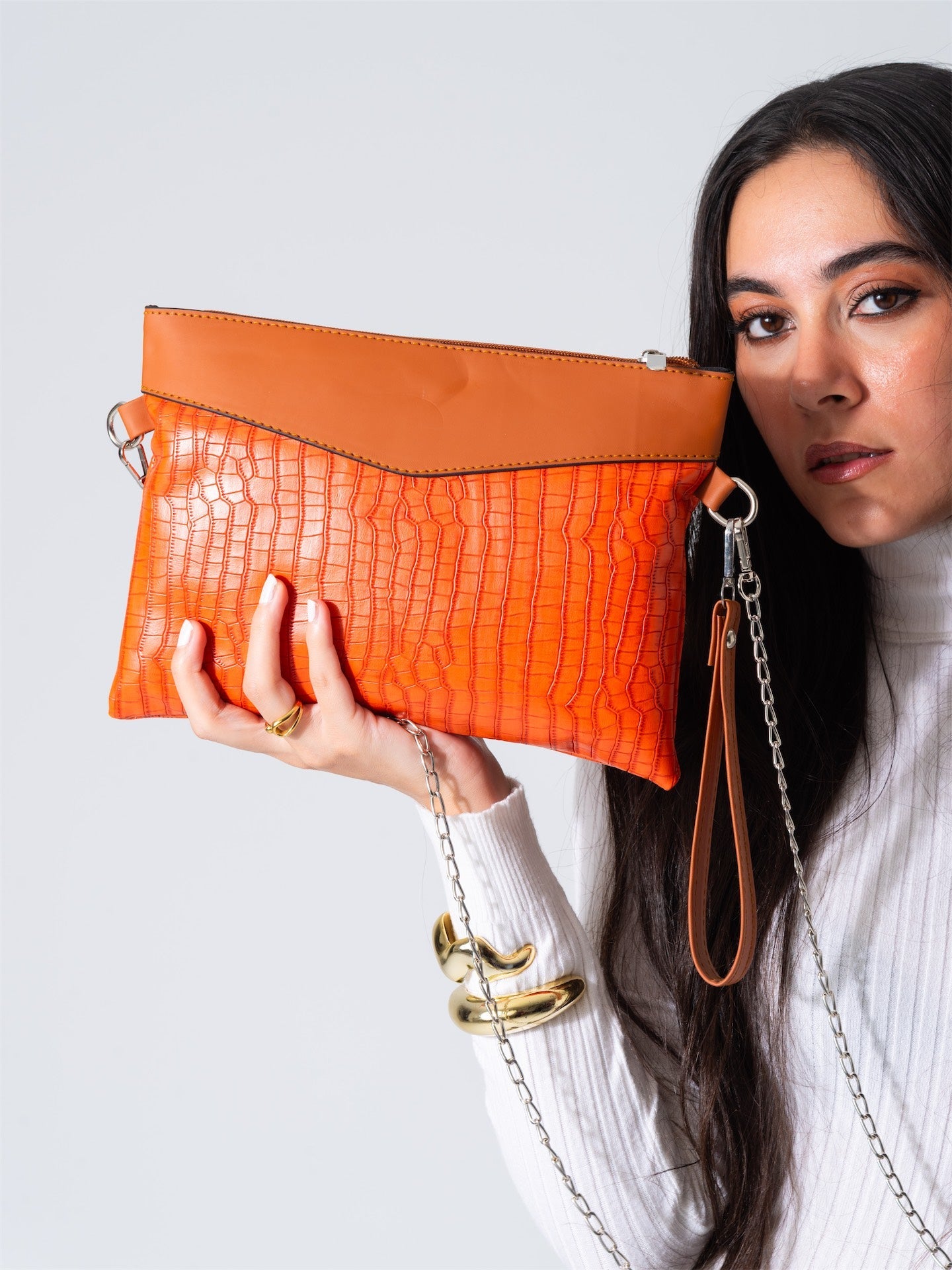 Elevate your evening ensemble with this striking metallic texture clutch in vibrant orange. Crafted with meticulous attention to detail, the shimmering surface catches light beautifully, adding sophisticated glamour to any occasion. The compact silhouette fits essentials effortlessly while the rich orange hue makes a bold statement. Perfect for cocktail events, dinners, or upscale gatherings where refined style matters. A versatile accessory that transitions seamlessly from day to night.