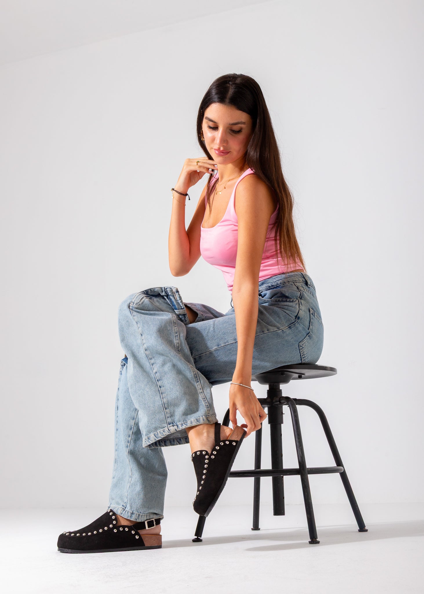 Discover the Studded Suede Clog in black, a refined blend of classic craftsmanship and edgy details. Featuring soft suede material accented with durable studs, these clogs offer both comfort and a sophisticated, modern look. Designed to provide lasting wear and support, they are perfect for those who appreciate subtle boldness in everyday footwear.