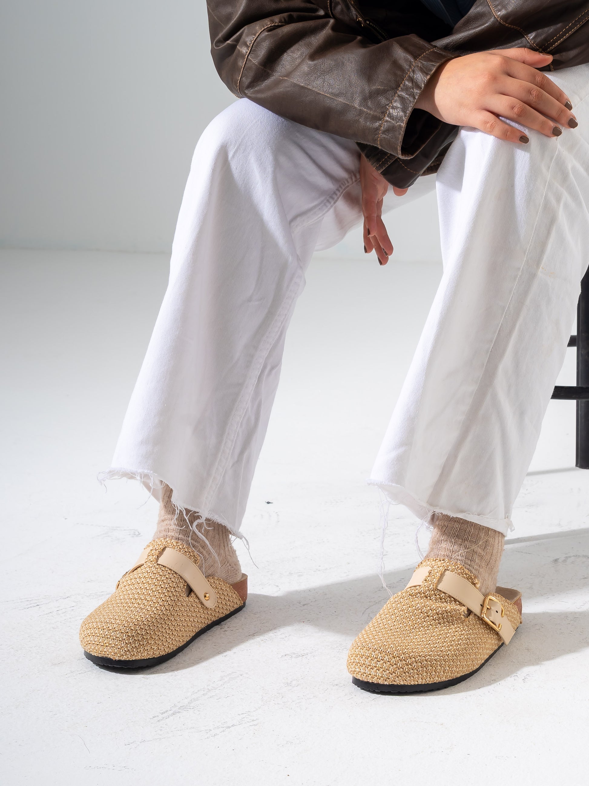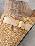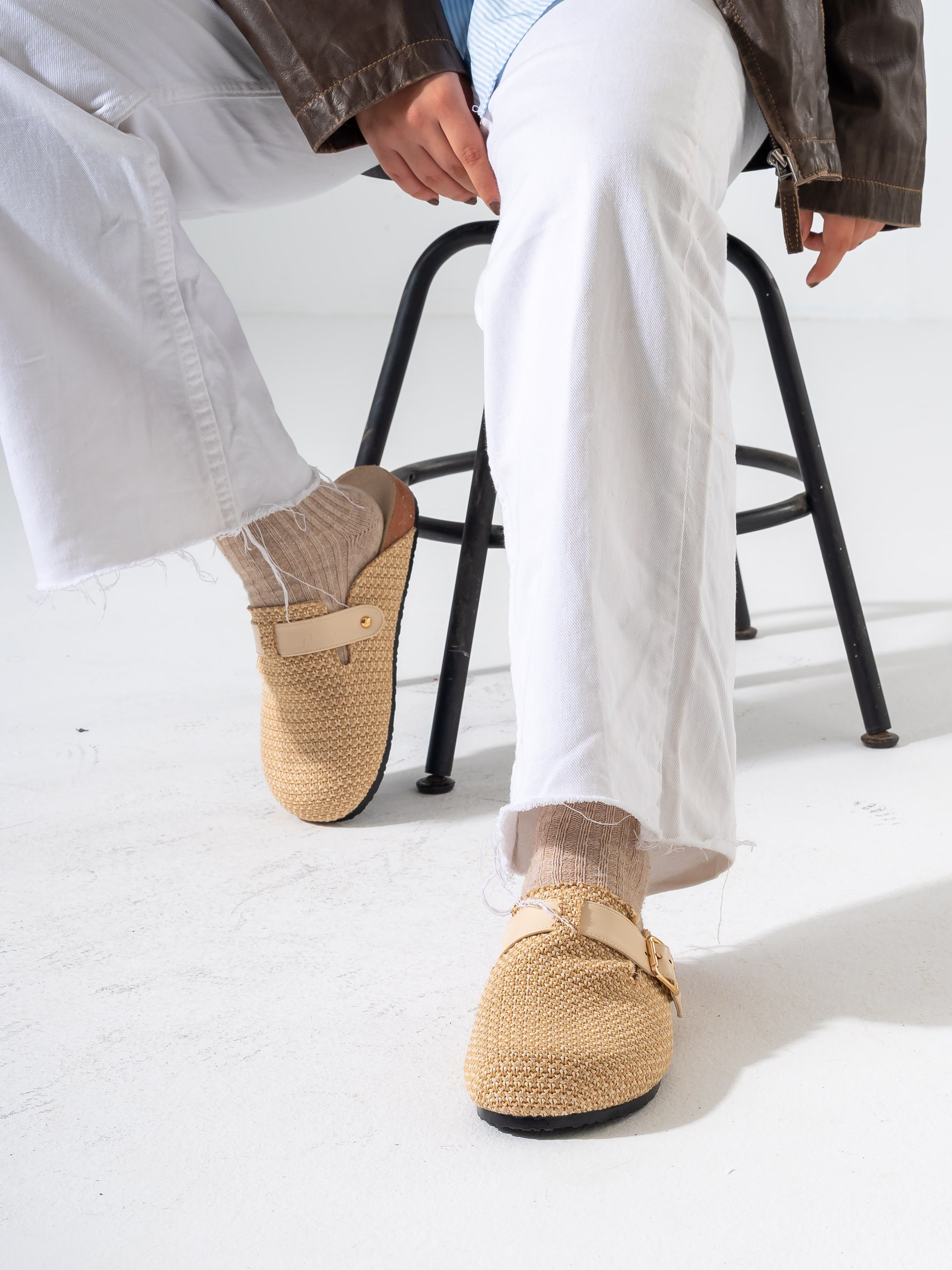 Woven raffia construction defines these clogs, merging artisanal aesthetics with practical wearability. The rounded toe and adjustable faux-leather strap with polished gold-tone buckle deliver a customizable fit suited to various foot shapes. An anatomically contoured footbed reduces fatigue during extended wear, while the aggressive lug sole provides reliable traction and durability across multiple surfaces. Ideal for those seeking versatile footwear that transitions seamlessly between casual and elevated occasions.