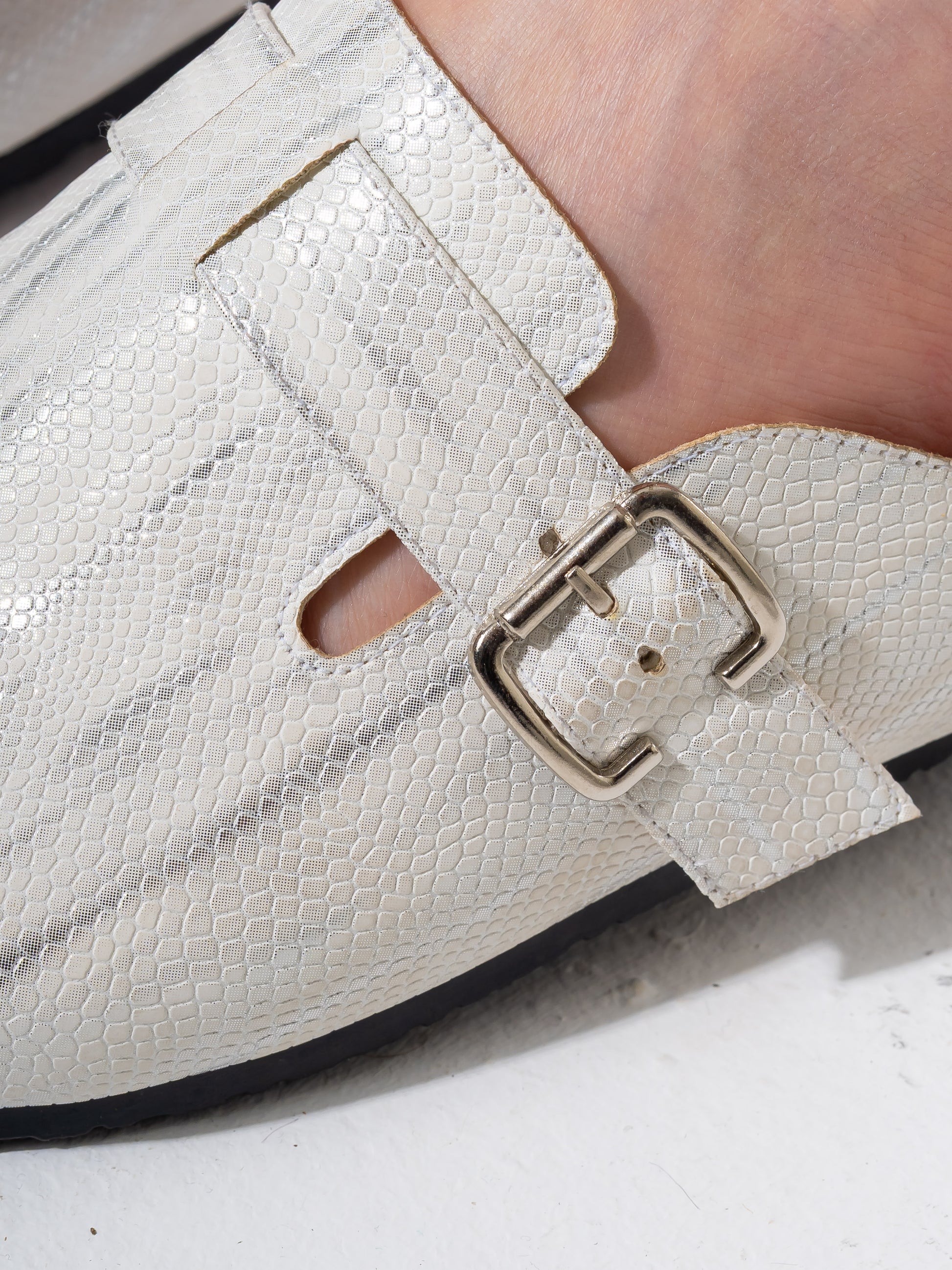 Elevate your daily look with these sophisticated clogs featuring a striking embossed reptile texture. Designed with an adjustable metallic buckle for a custom fit and a contoured footbed for all-day support, these stylish slip-ons offer the perfect blend of exotic flair and casual comfort.