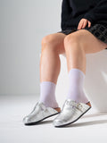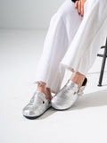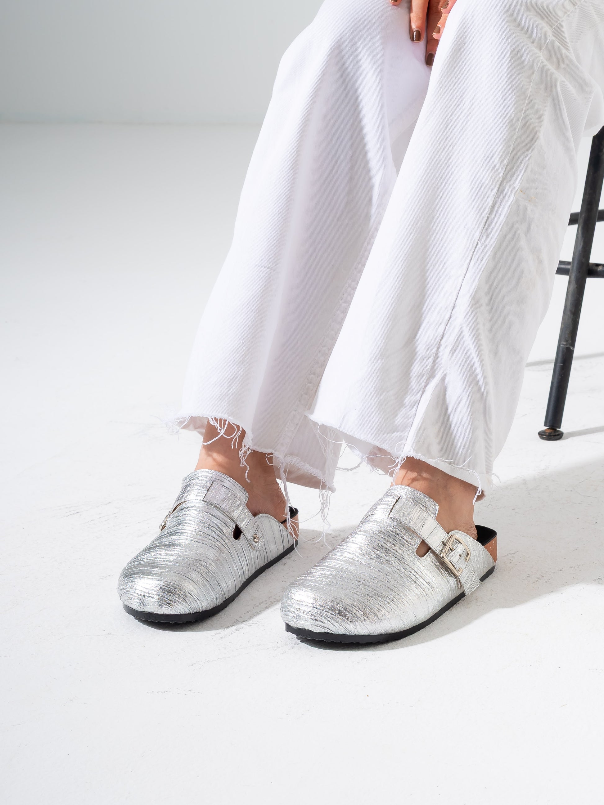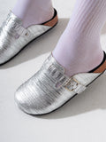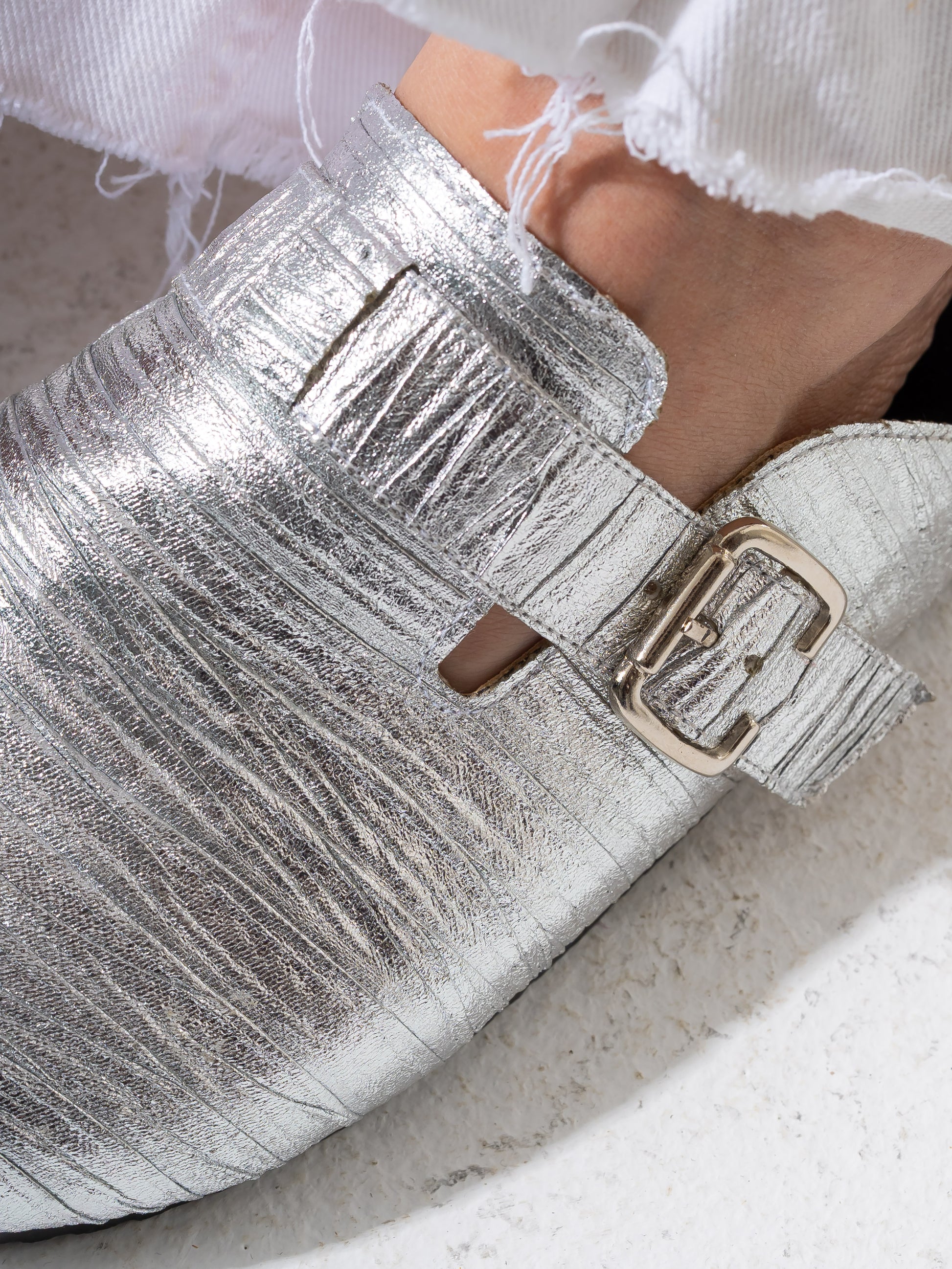 Step into modern comfort with these eye-catching clogs. Featuring a unique crinkled metallic finish and an adjustable side buckle, these shoes blend effortless style with a bold textured look. Perfect for adding a statement touch to any casual outfit.
