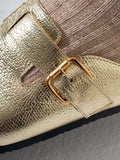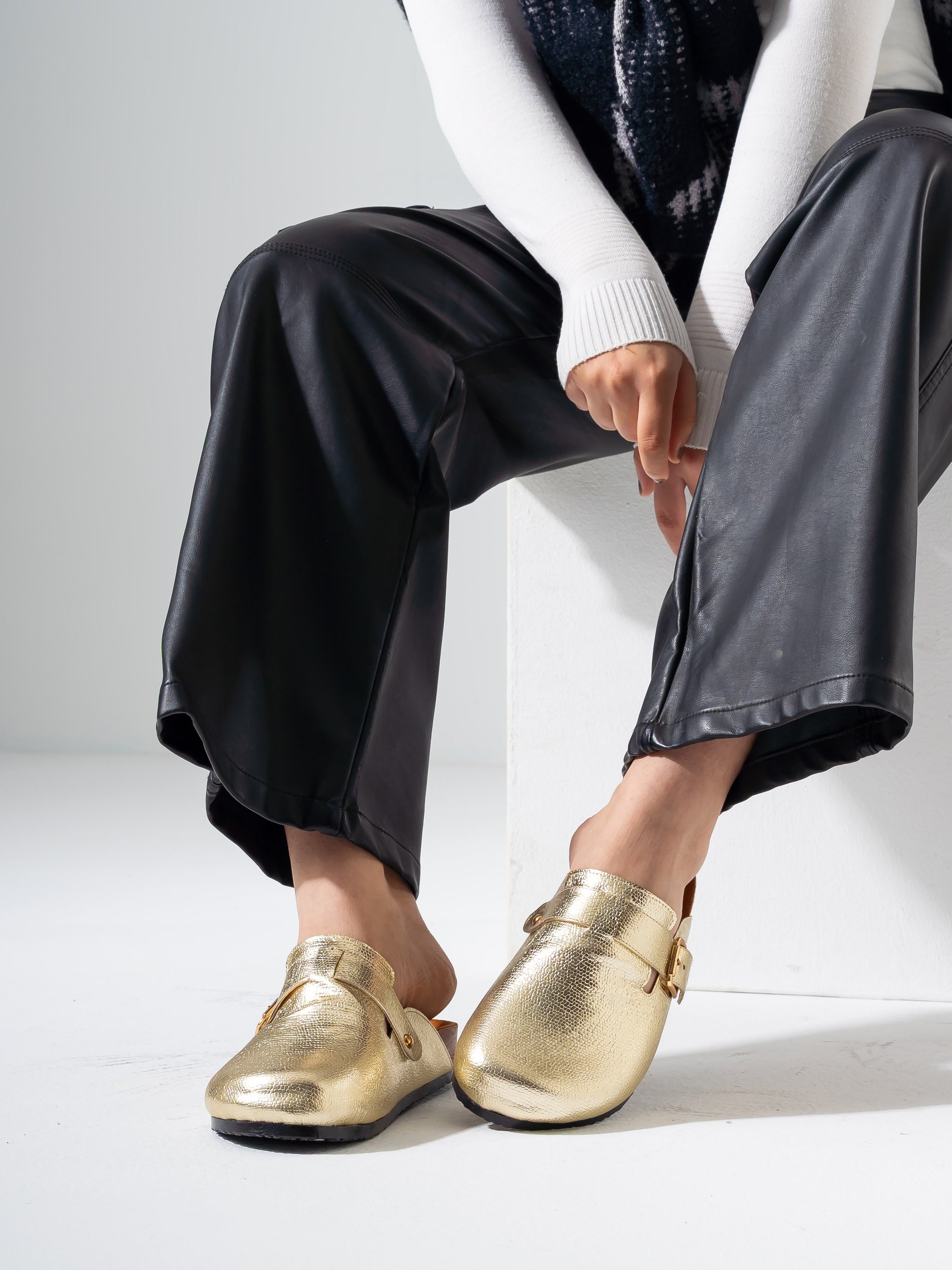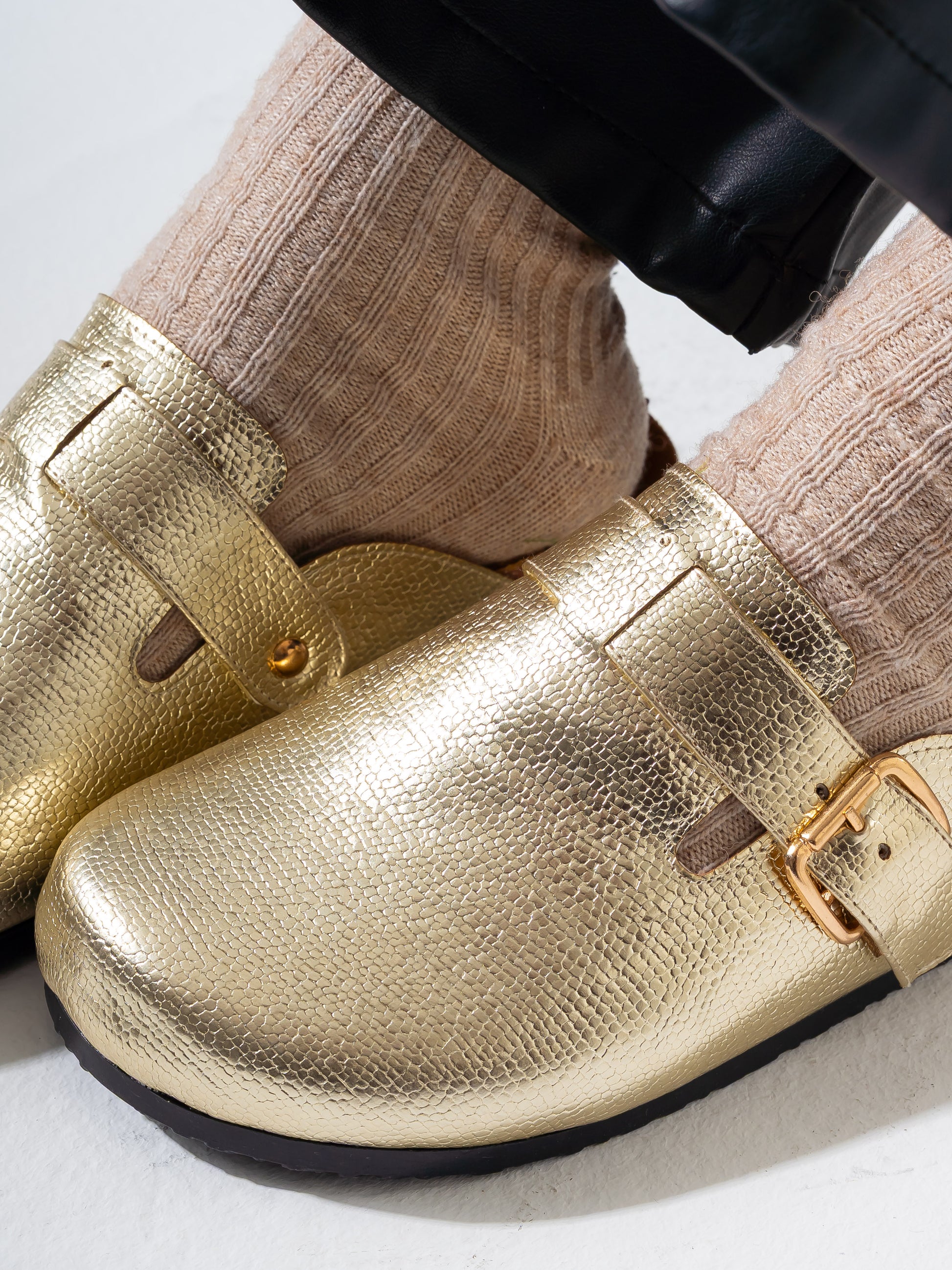 Elevate your everyday comfort with these shimmer finish clogs, crafted to deliver both style and functionality. The lustrous gold coating catches the light beautifully, making them a standout choice for casual wear or professional settings. Engineered with premium comfort technology, these clogs feature supportive cushioning and a secure fit that keeps you comfortable throughout the day. The durable construction ensures long-lasting wear, while the easy-to-clean surface makes maintenance effortless. Perfect for those seeking a sophisticated blend of glamour and practicality.