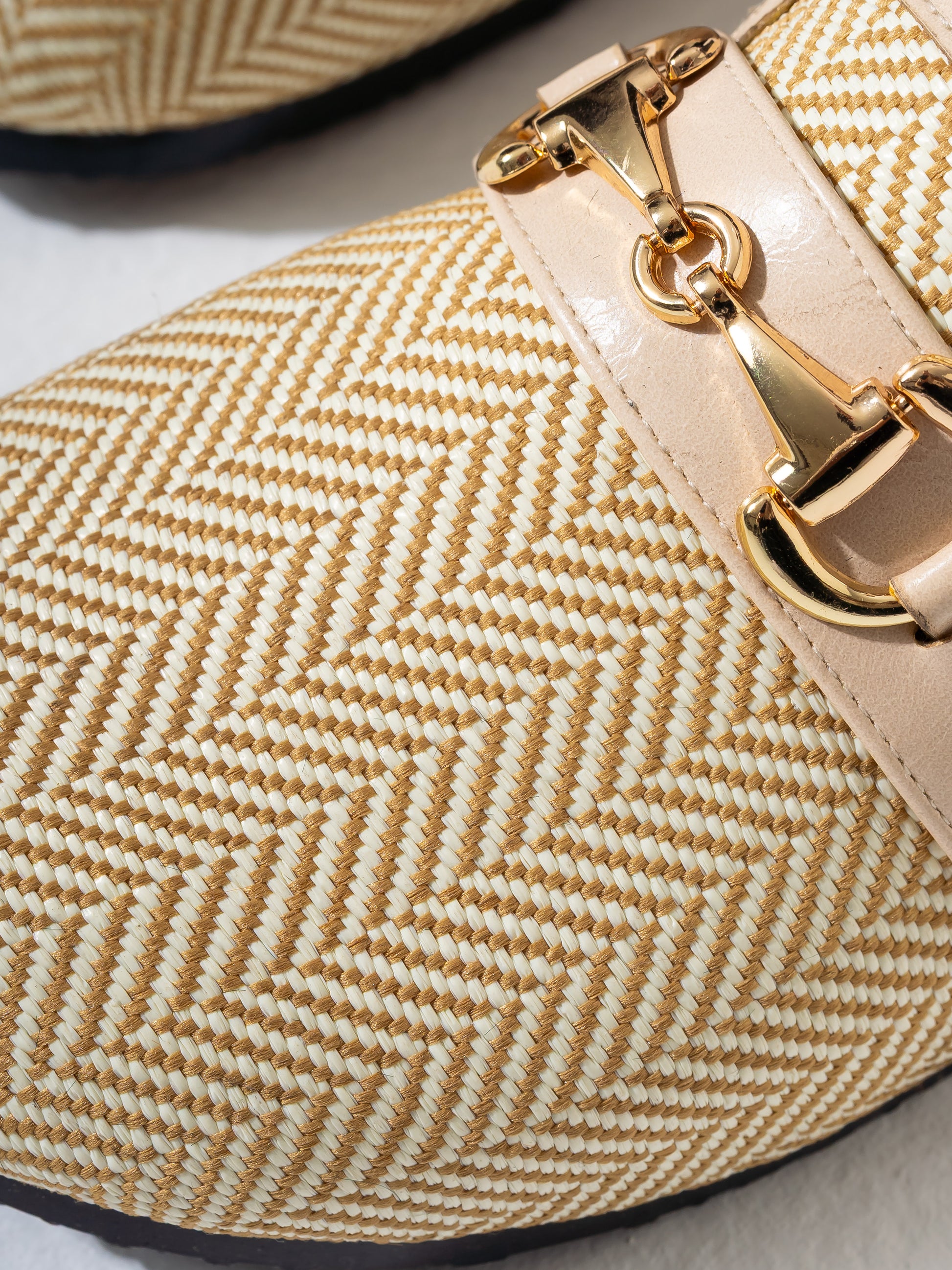 Chevron Woven Horsebit Clogs combine timeless equestrian-inspired design with contemporary comfort. Featuring a distinctive horsebit detail and chevron woven pattern, these clogs deliver sophisticated style for everyday wear. The slip-on silhouette ensures effortless dressing, while the structured clog sole provides reliable support and durability. Perfect for those seeking refined footwear that transitions seamlessly from casual to polished occasions.