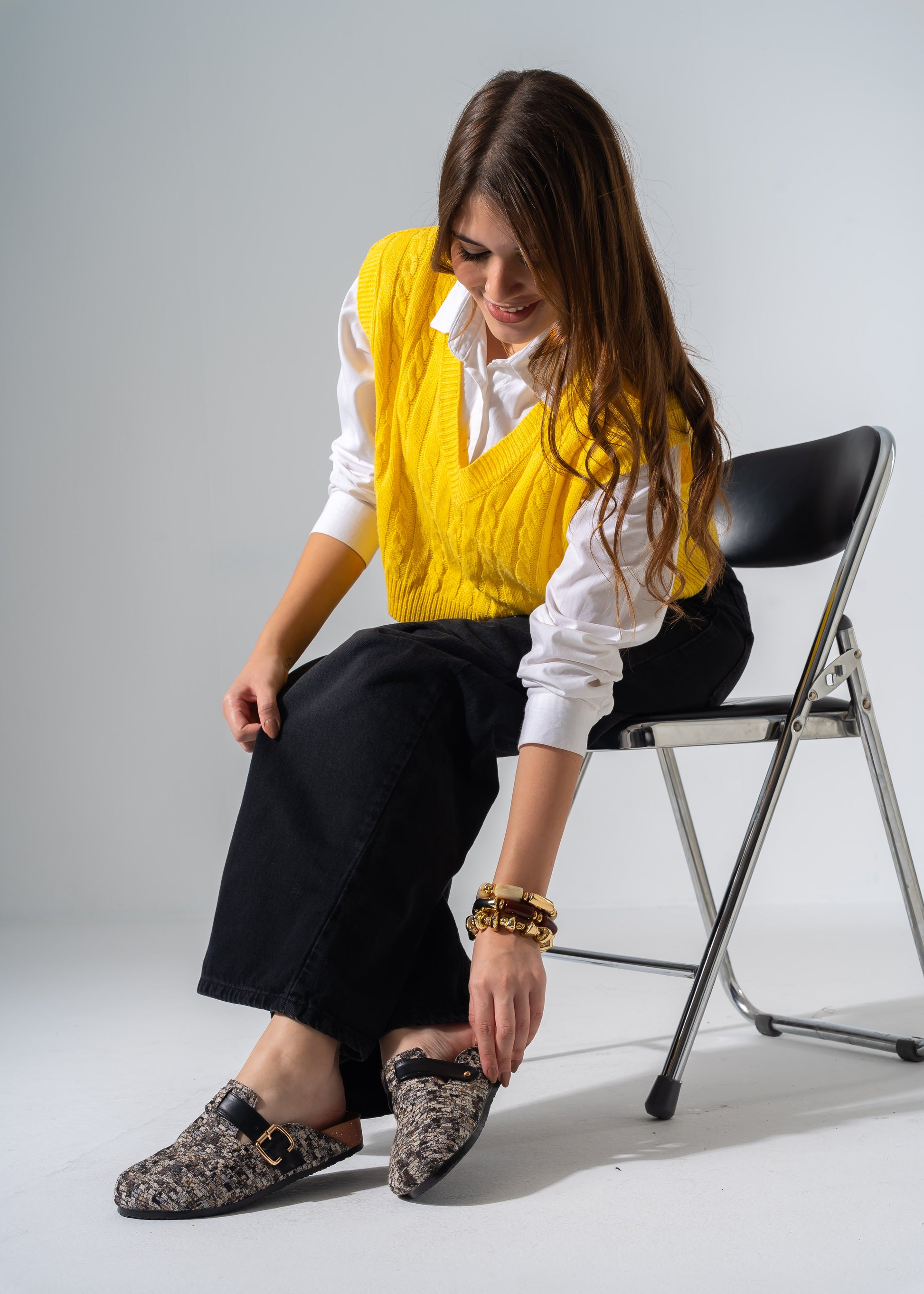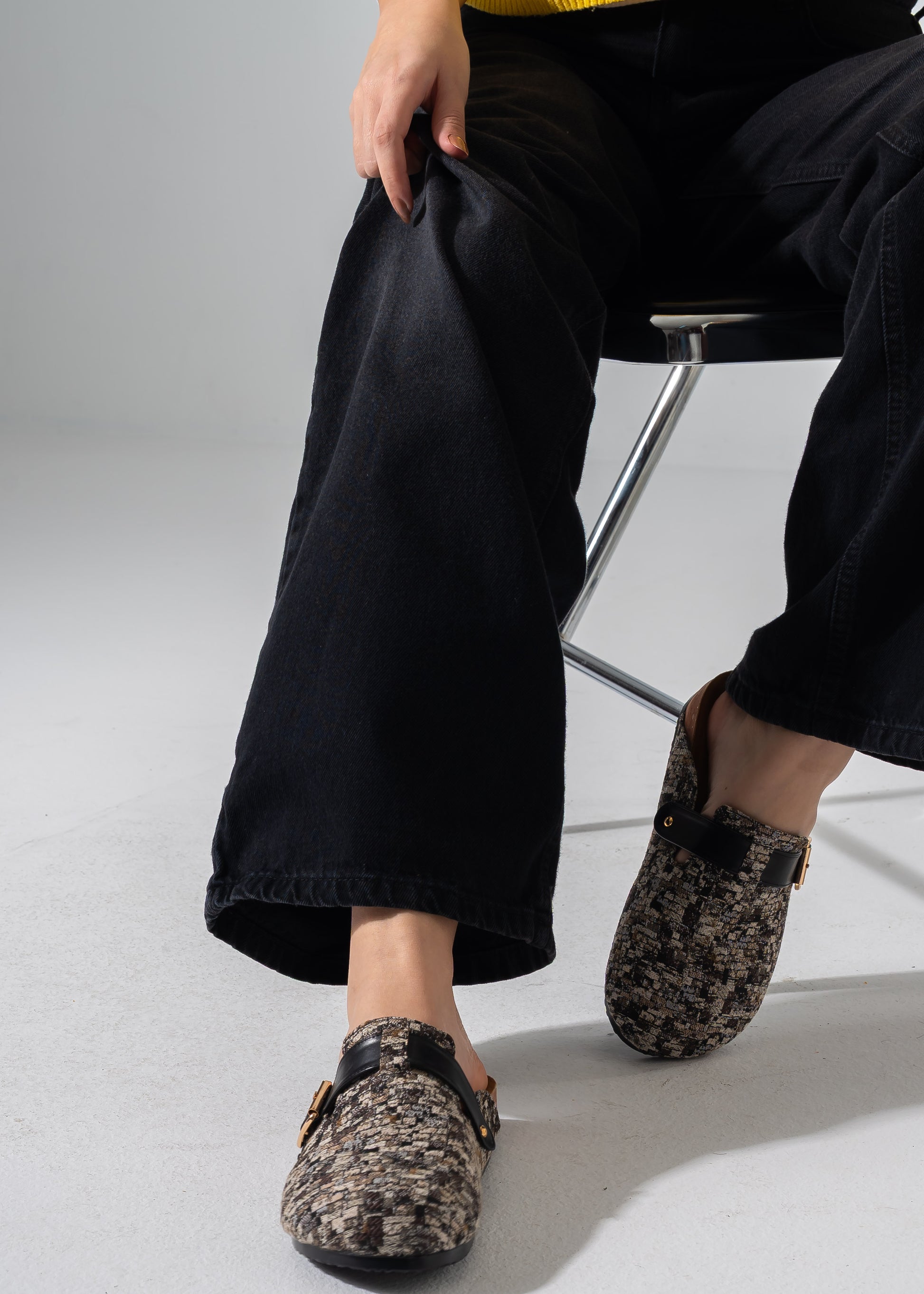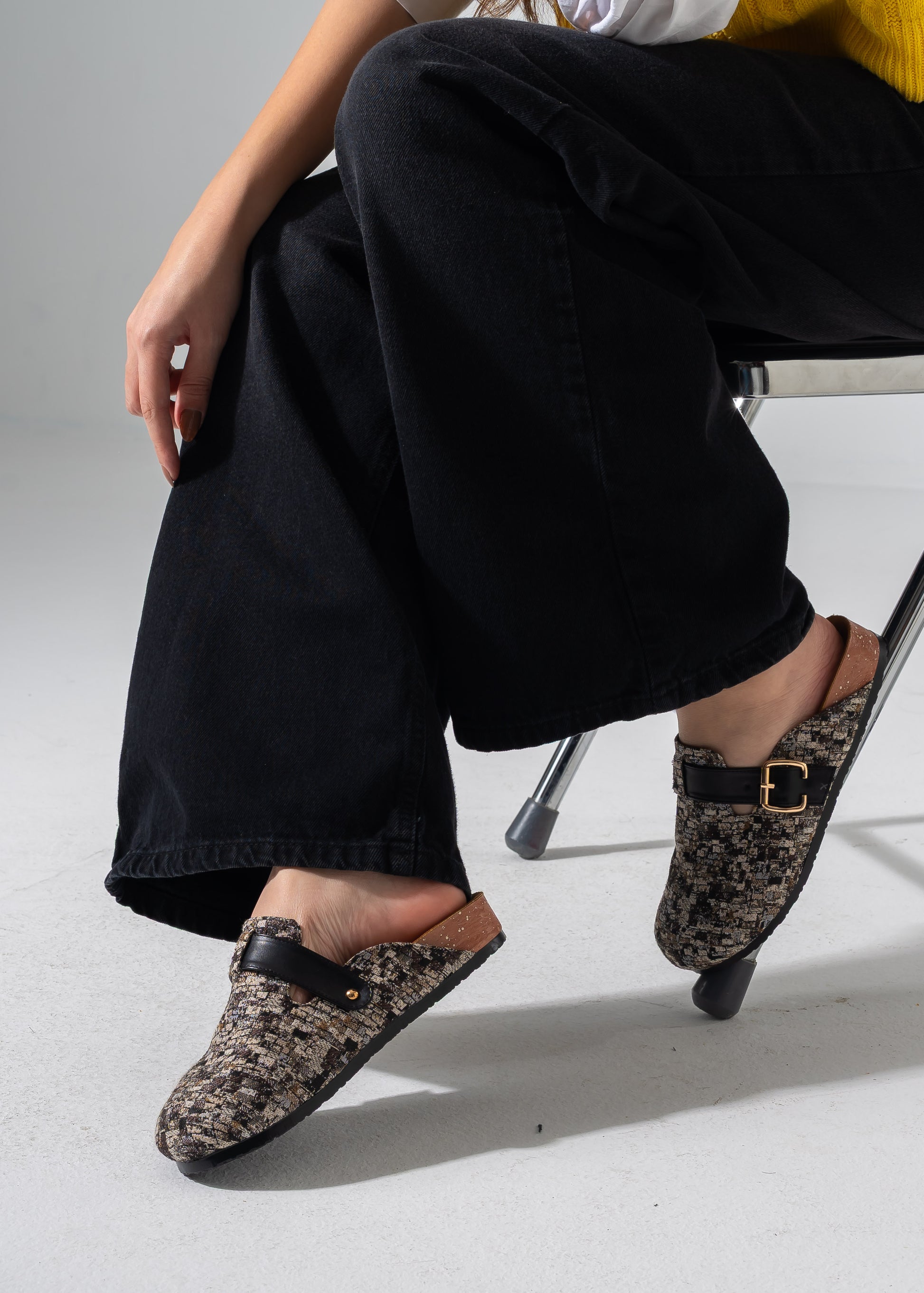 Blending timeless texture with modern comfort, these mules feature a high-quality tweed finish and a striking gold-tone buckle detail. Designed with a supportive footbed for all-day wear, they are the perfect transition piece from office hours to weekend outings.