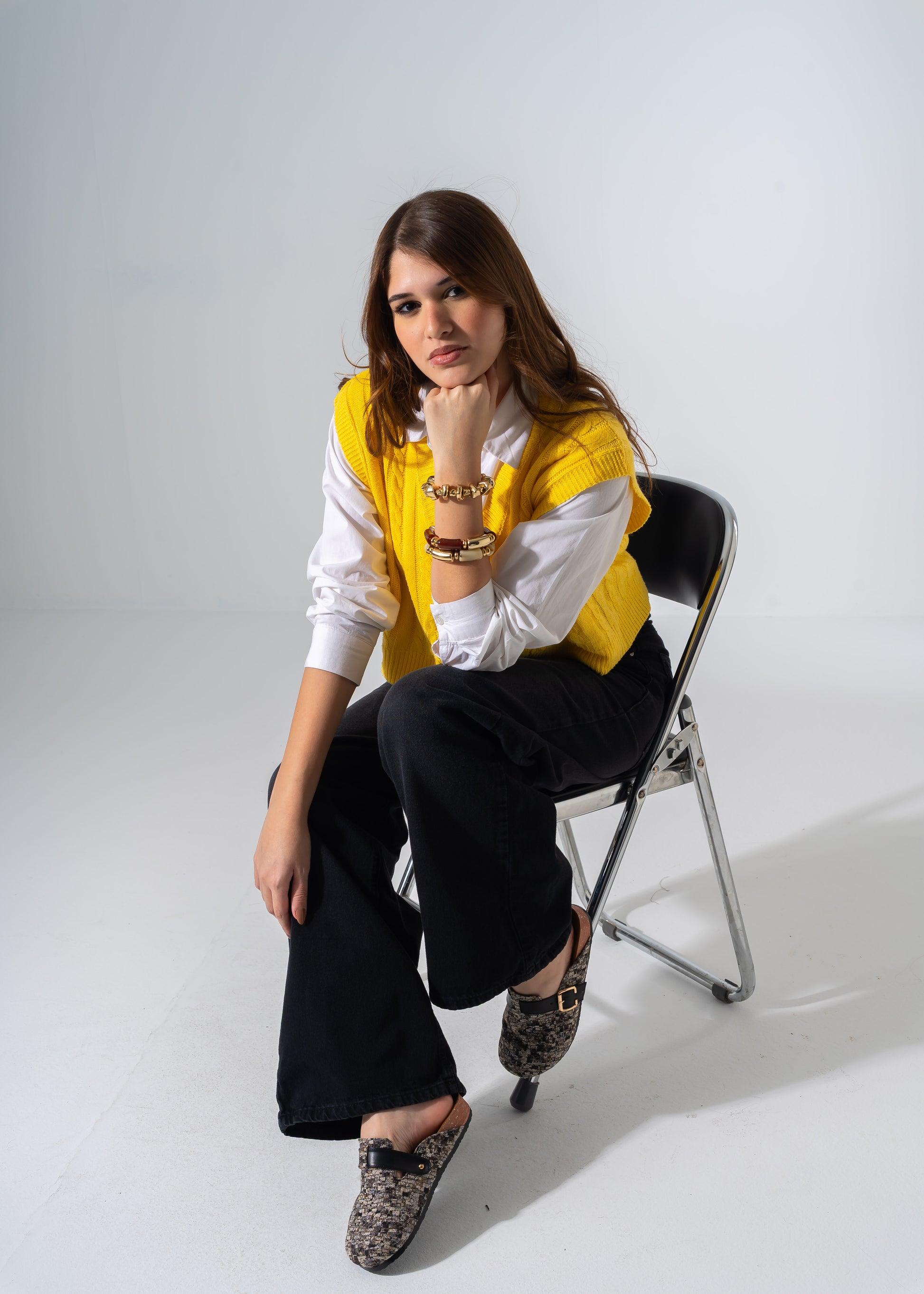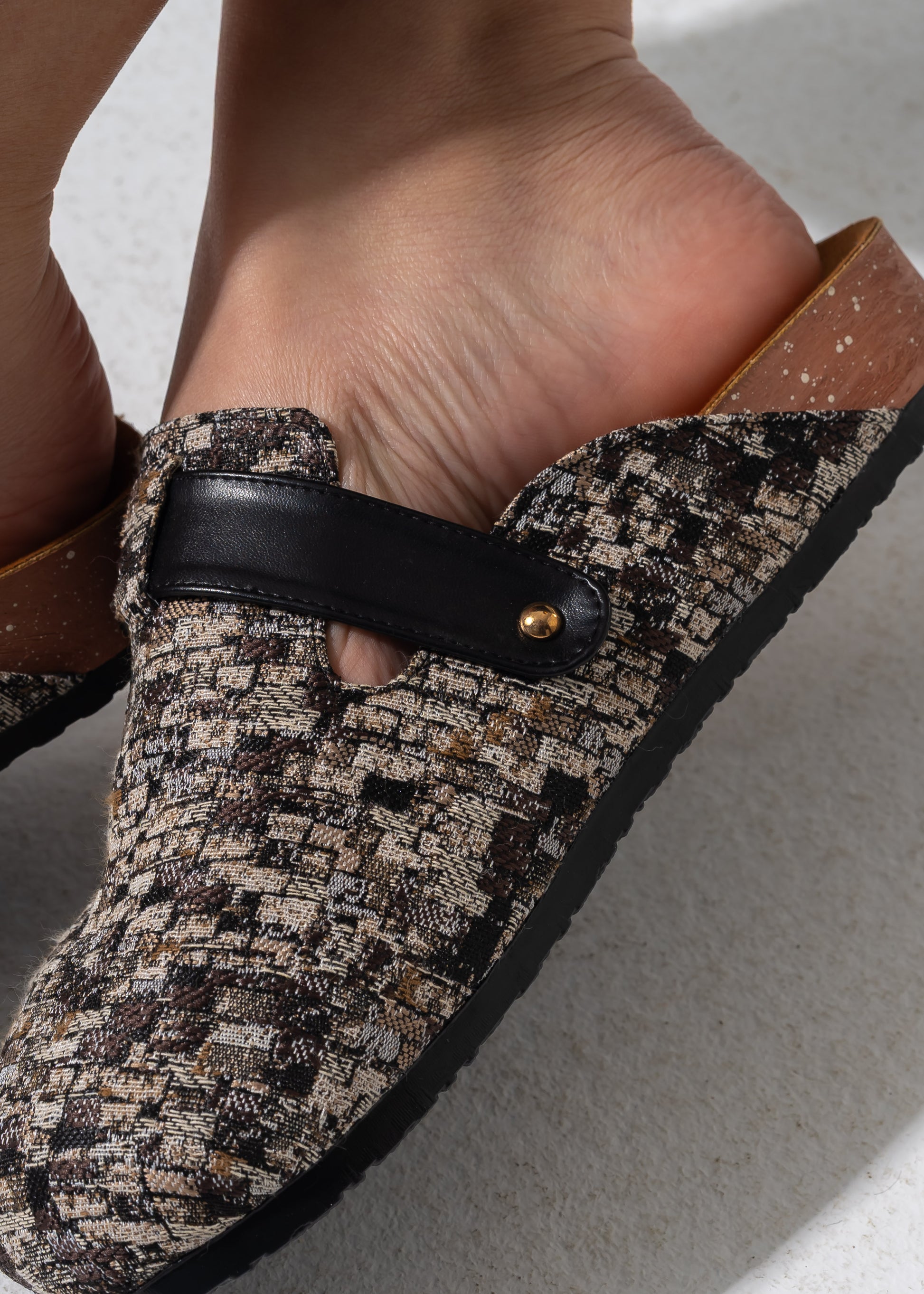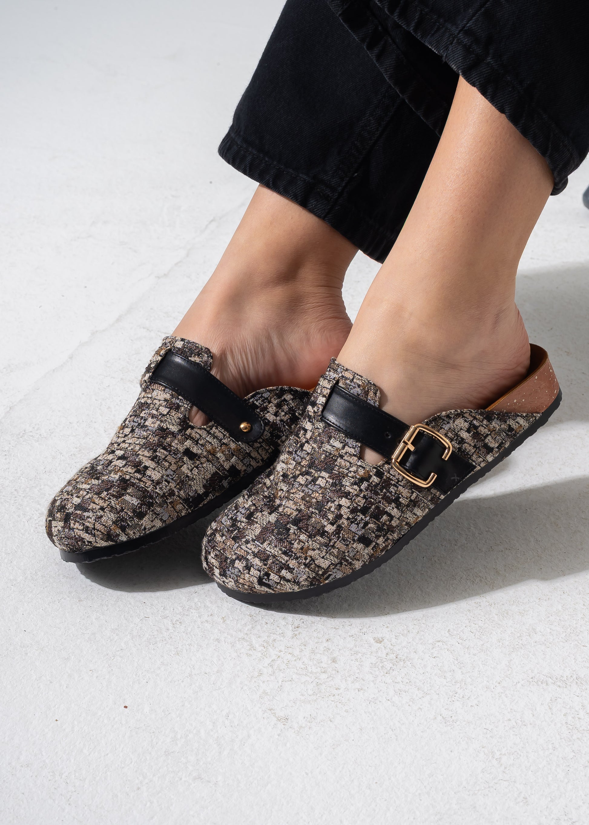 Blending timeless texture with modern comfort, these mules feature a high-quality tweed finish and a striking gold-tone buckle detail. Designed with a supportive footbed for all-day wear, they are the perfect transition piece from office hours to weekend outings.