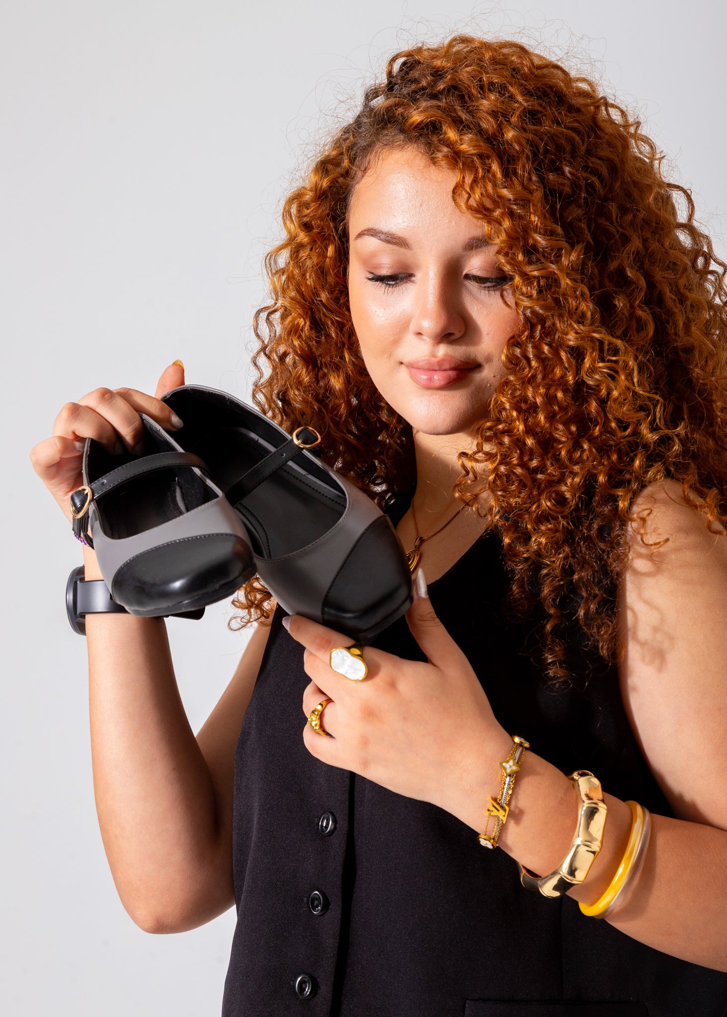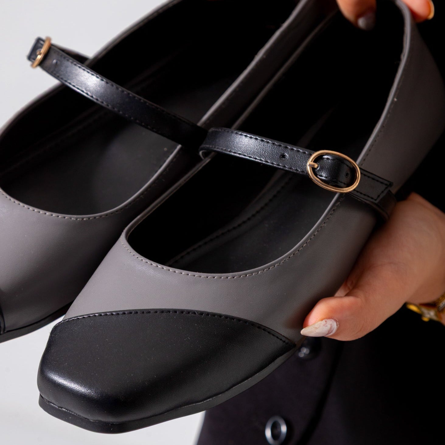 These Two-Tone Strappy Flats in gray combine minimalist design with versatile comfort. Featuring adjustable straps for a secure fit, they offer unobtrusive support ideal for daily wear. The flat sole ensures ease of movement while maintaining a sleek, modern aesthetic suitable for various occasions. Crafted for practicality and style, these flats are a reliable choice for those seeking understated elegance.