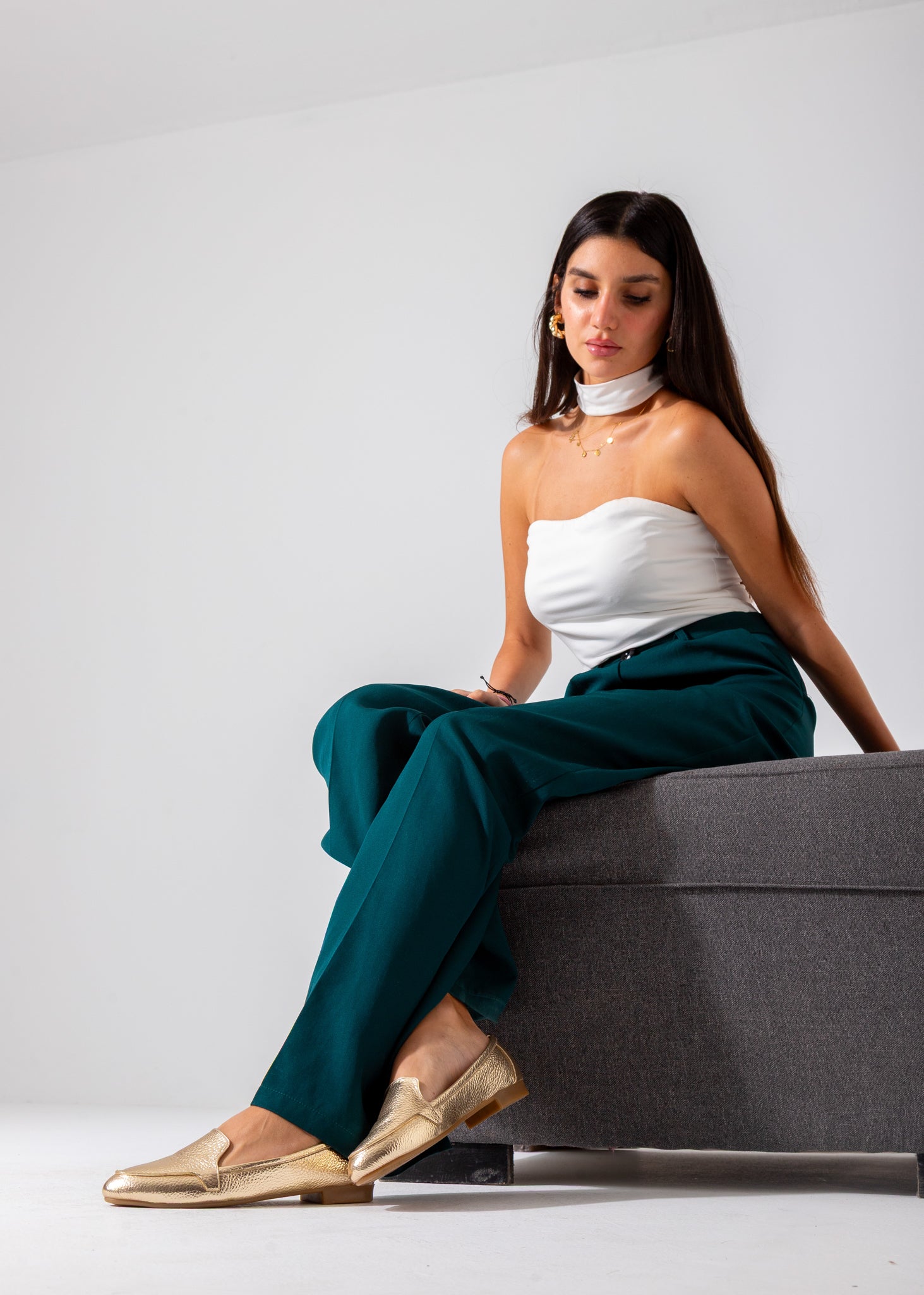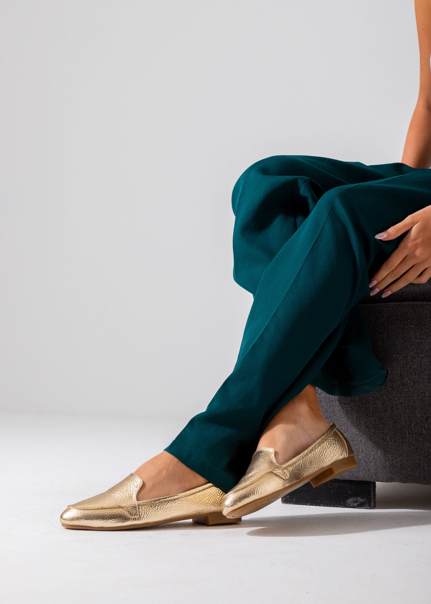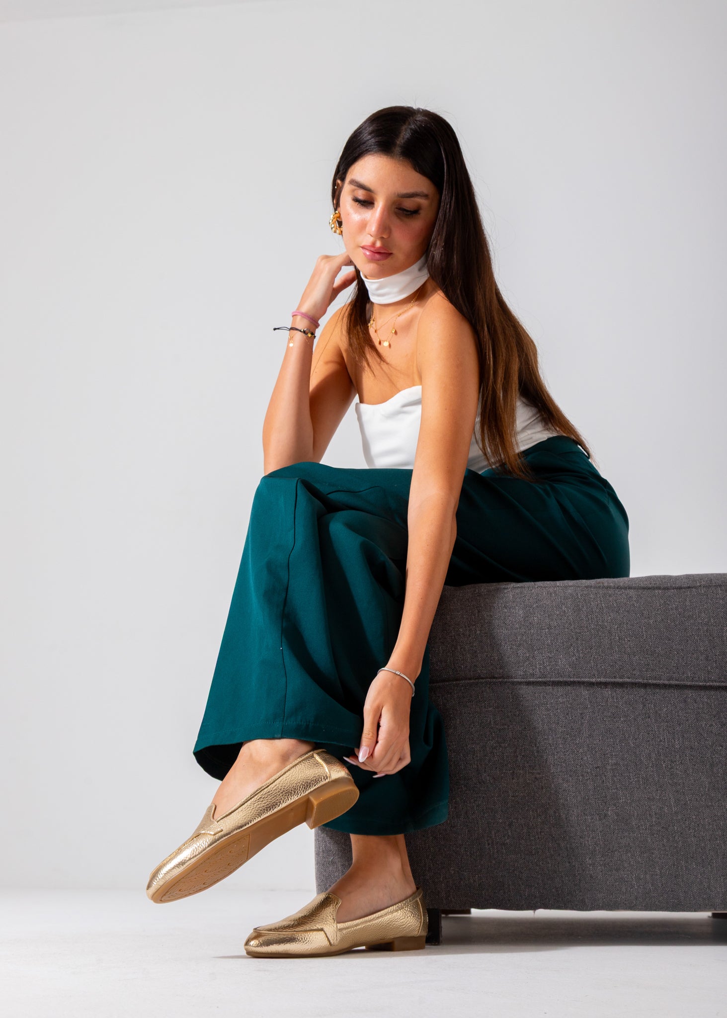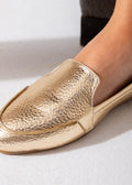 Experience elegance and ease with the Metallic Slip-On Flat-gold. Crafted for both style and comfort, this flat shoe features a sleek metallic gold finish that complements any outfit. Its slip-on design ensures quick, hassle-free wear, making it ideal for busy days or casual outings. The flat sole provides stability and support, perfect for all-day wear without compromising on sophistication. Elevate your footwear collection with this versatile and refined choice.