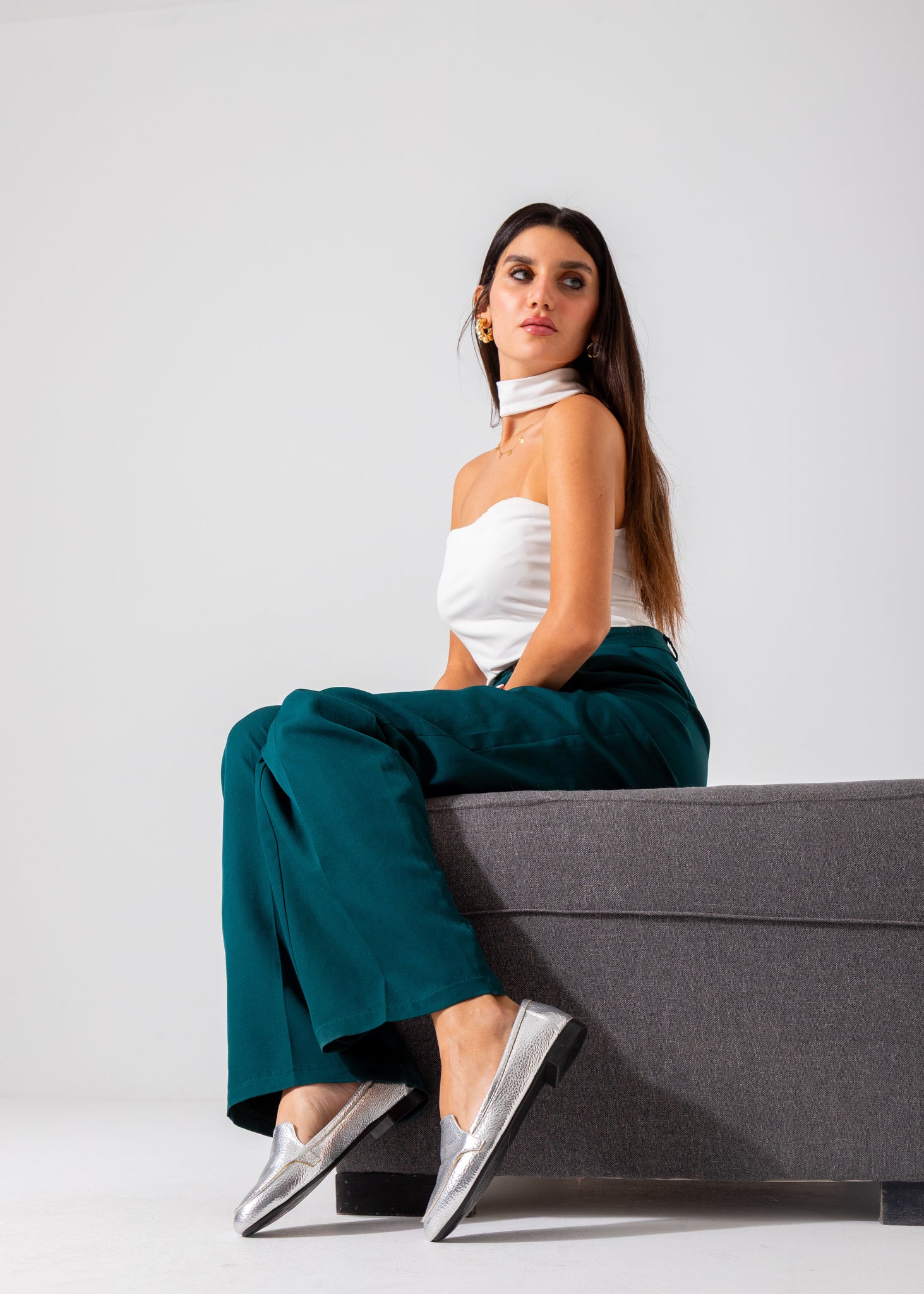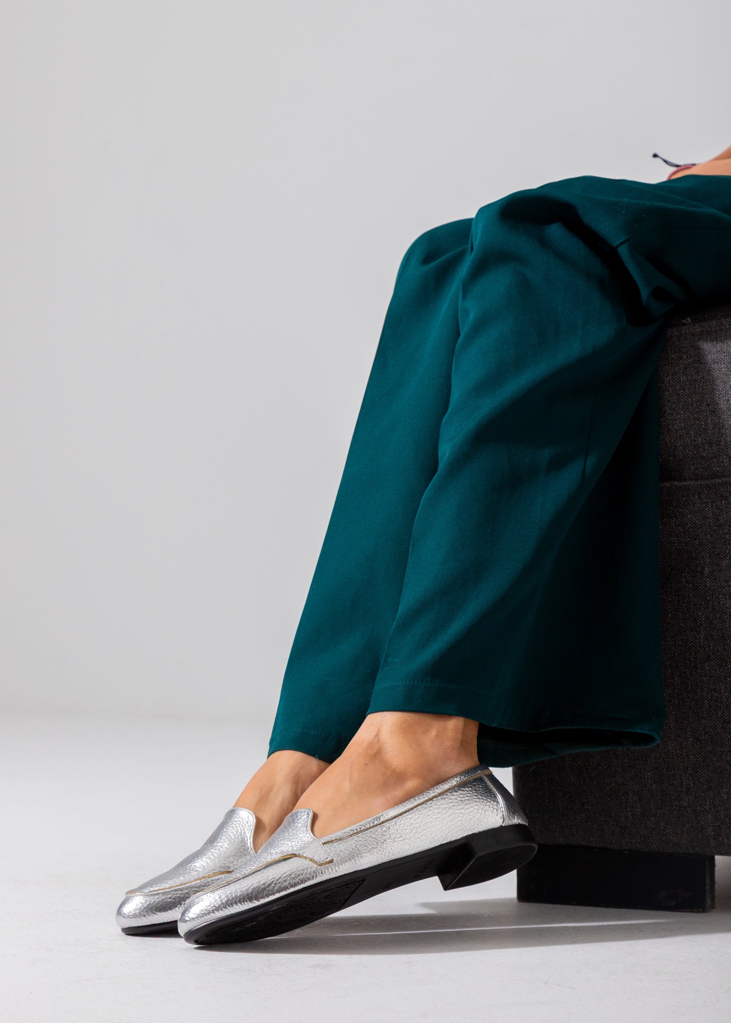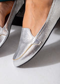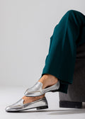 Experience effortless style and comfort with the Metallic Slip-On Flat in silver. Designed for easy wear, its sleek metallic finish adds a polished touch to any outfit. The flat sole ensures all-day comfort while maintaining a modern, minimalist look ideal for both casual and professional settings.