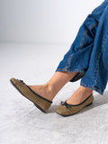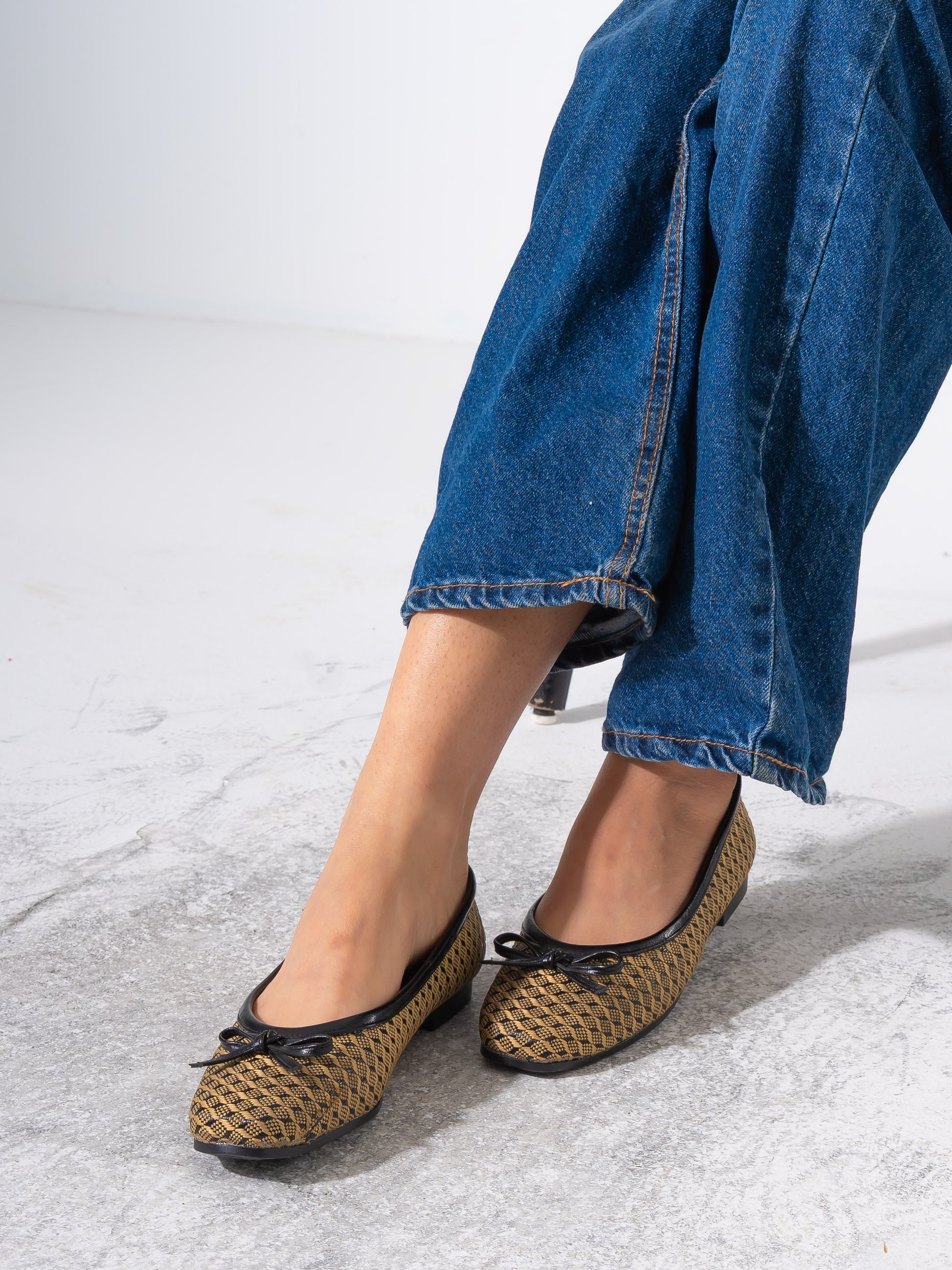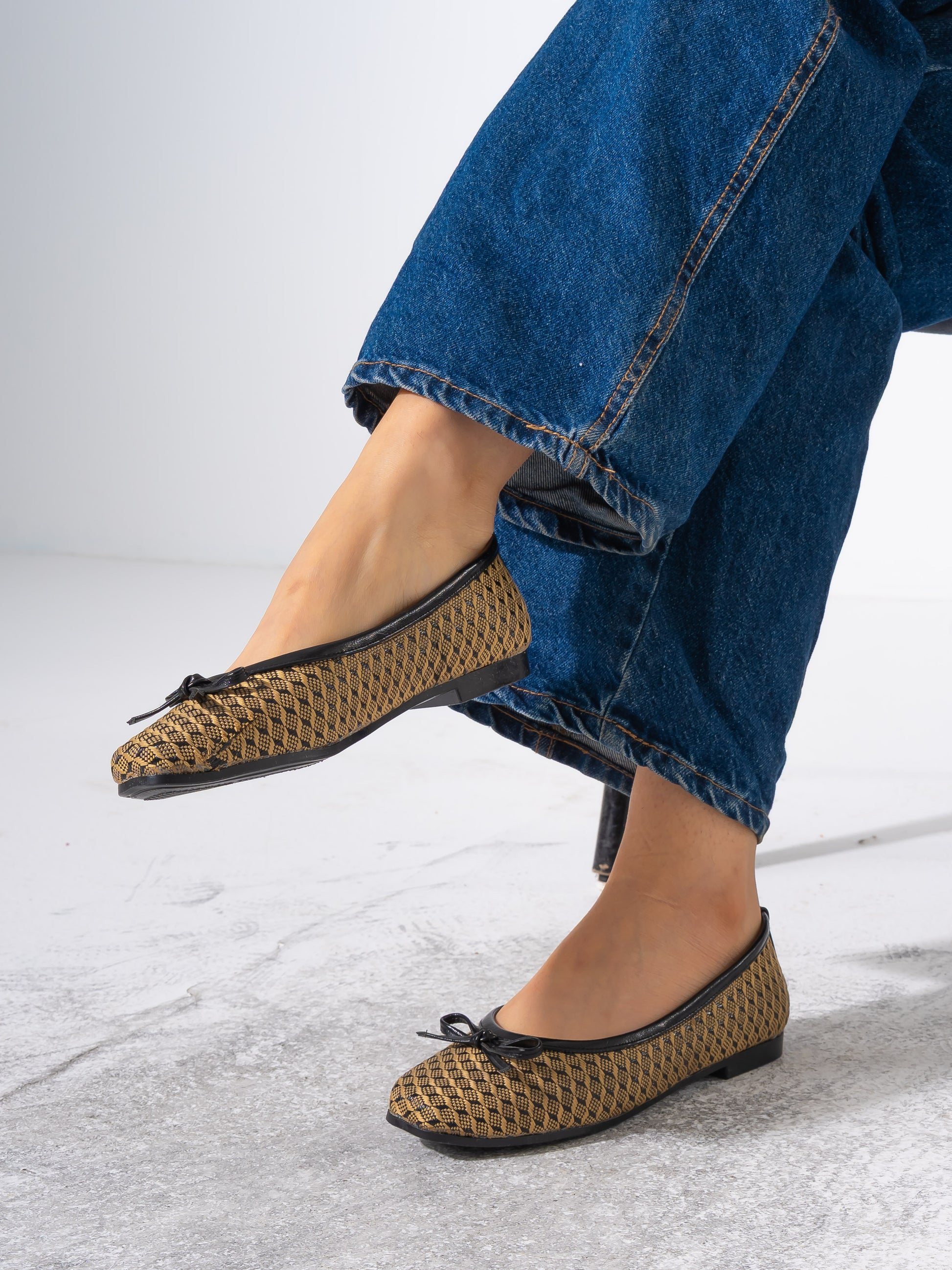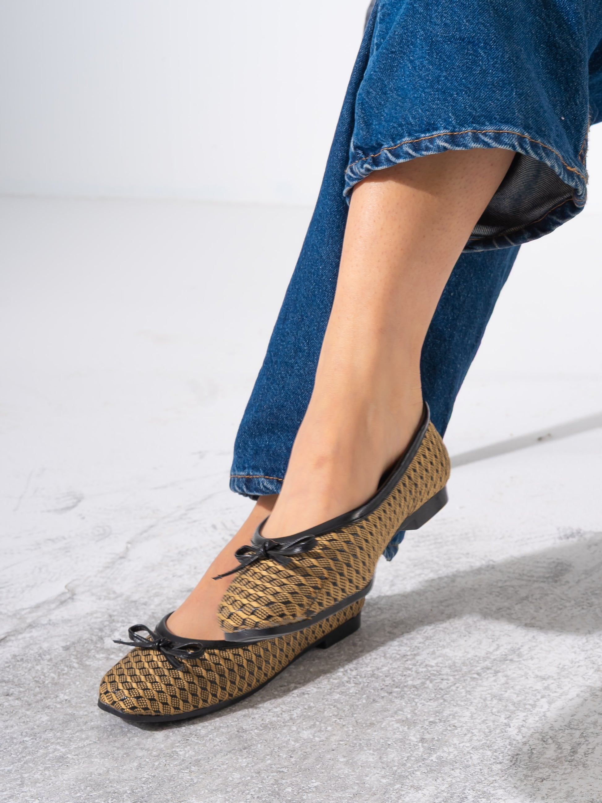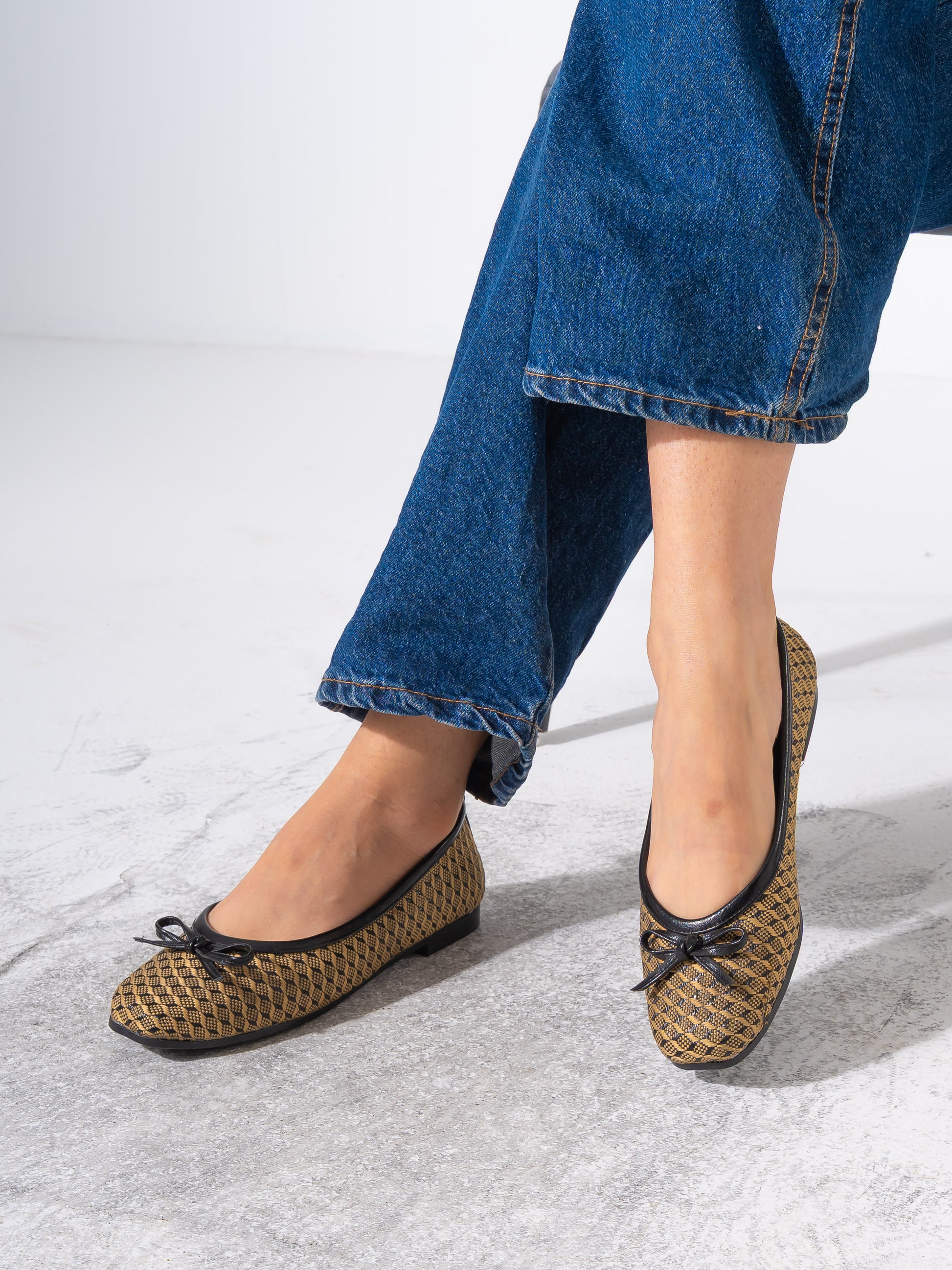 Step into effortless elegance with these patterned ballerina flats. Designed with a sophisticated geometric weave, these flats offer a perfect blend of classic style and modern texture. The delicate bow detail on the toe adds a feminine touch, making them versatile enough for both office wear and casual outings.