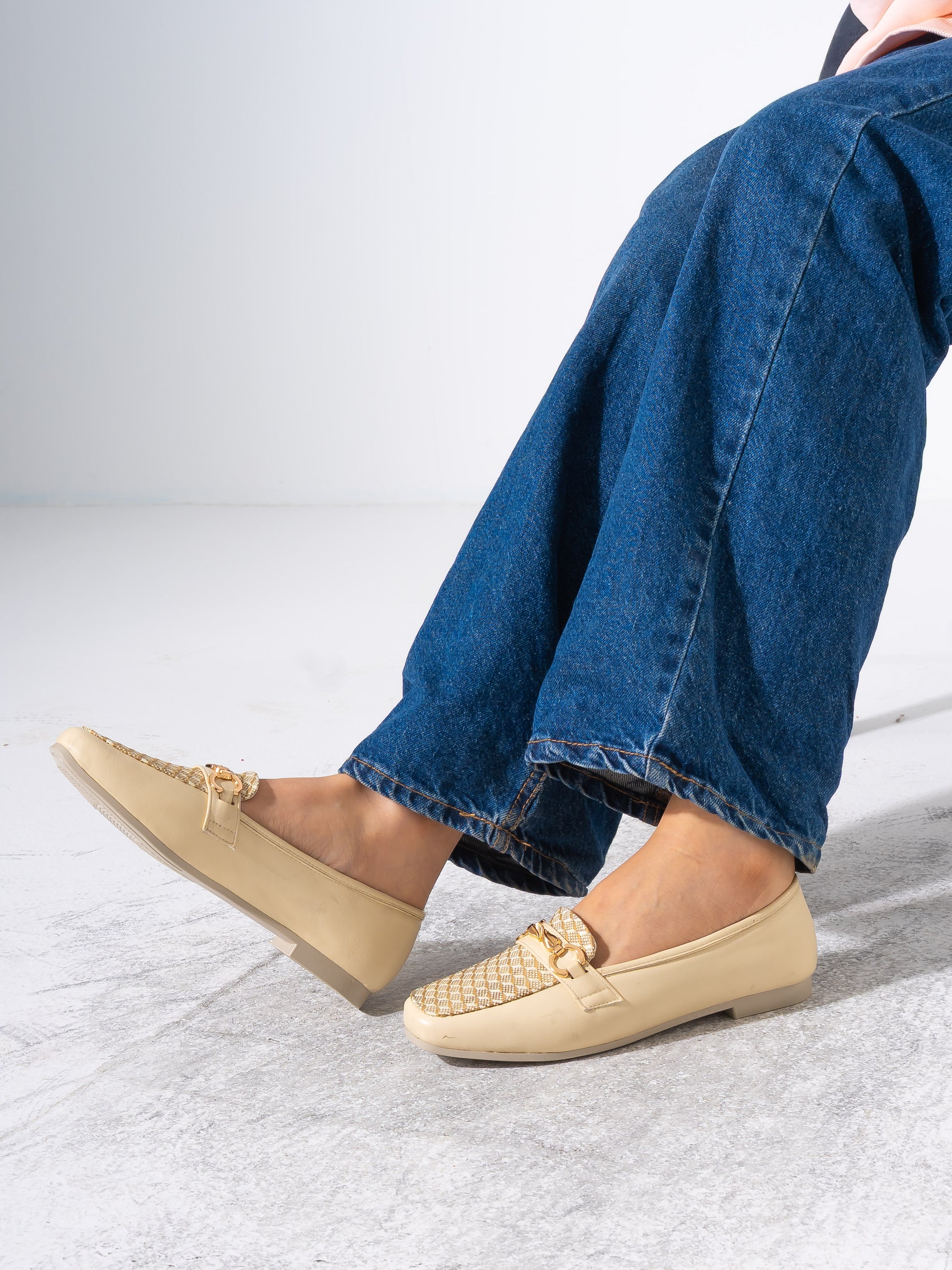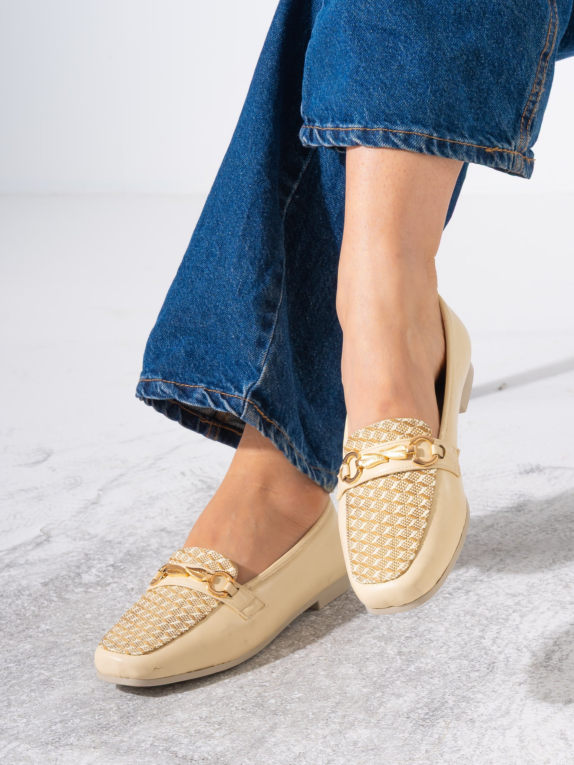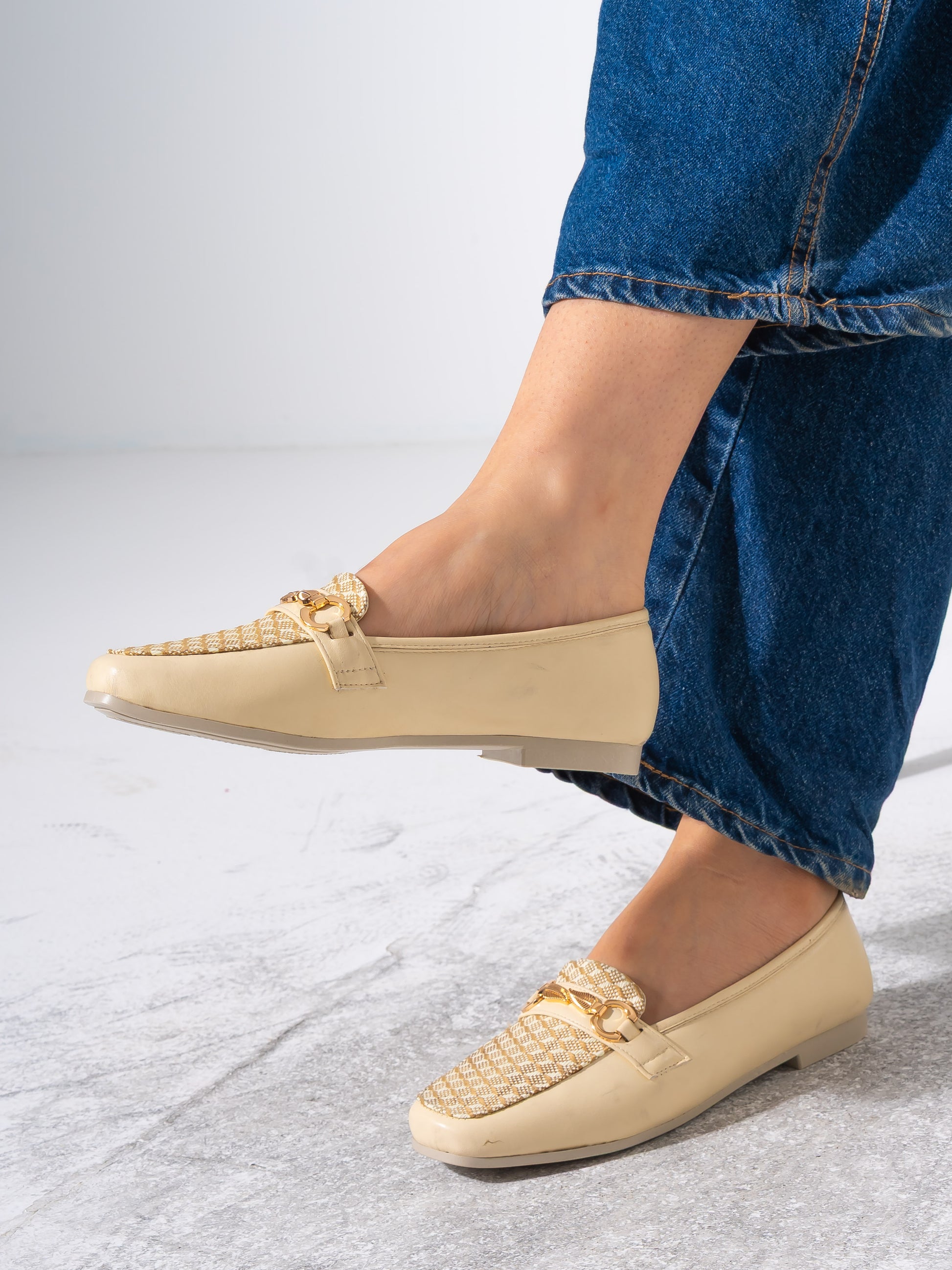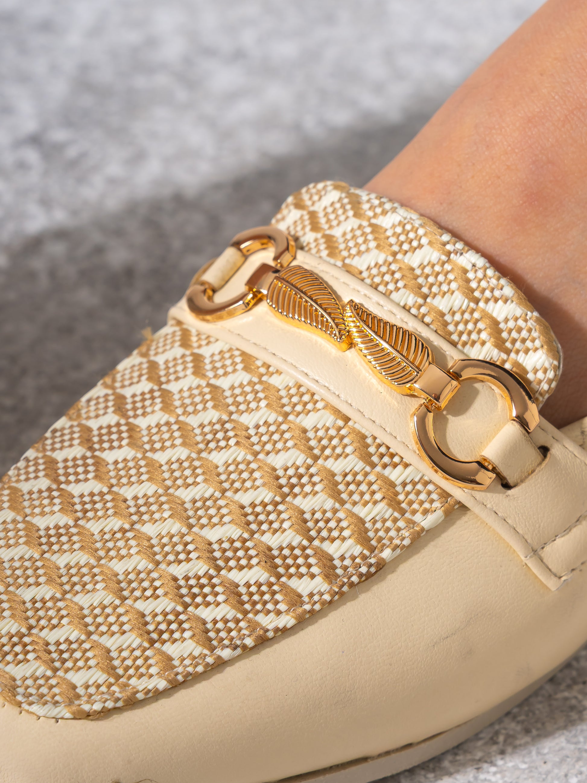 Elevate your daily ensemble with these sophisticated loafers, featuring a unique blend of textures. Designed with a textured woven panel on the vamp and accented by a decorative gold-tone leaf buckle, these shoes offer a refined aesthetic. The square-toe silhouette and flat sole ensure a comfortable fit for all-day wear, making them a perfect choice for both office attire and casual outings