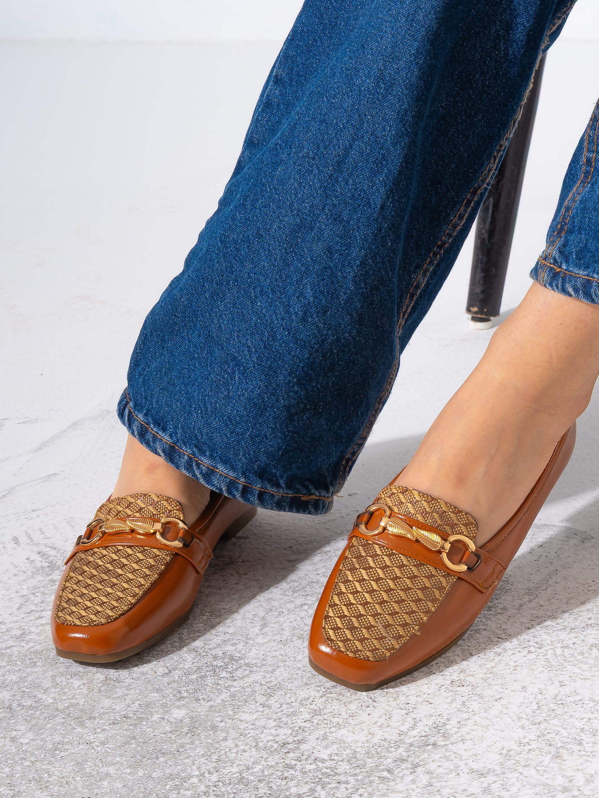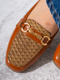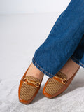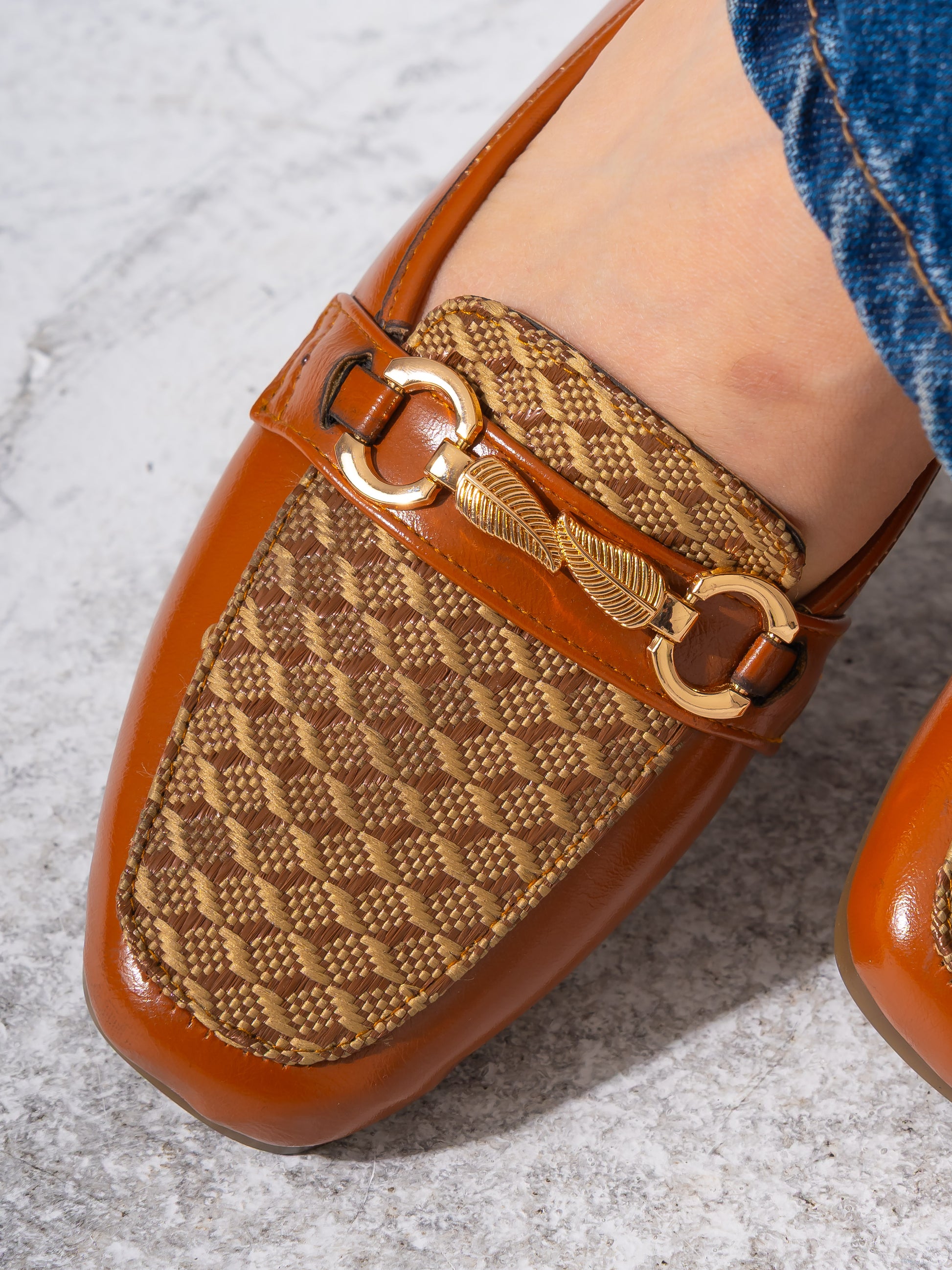 Elevate your daily ensemble with these sophisticated loafers, featuring a unique blend of textures. Designed with a textured woven panel on the vamp and accented by a decorative gold-tone leaf buckle, these shoes offer a refined aesthetic. The square-toe silhouette and flat sole ensure a comfortable fit for all-day wear, making them a perfect choice for both office attire and casual outings