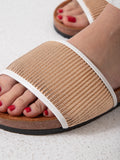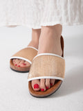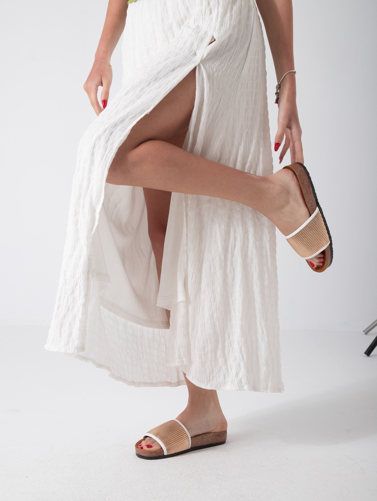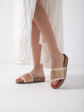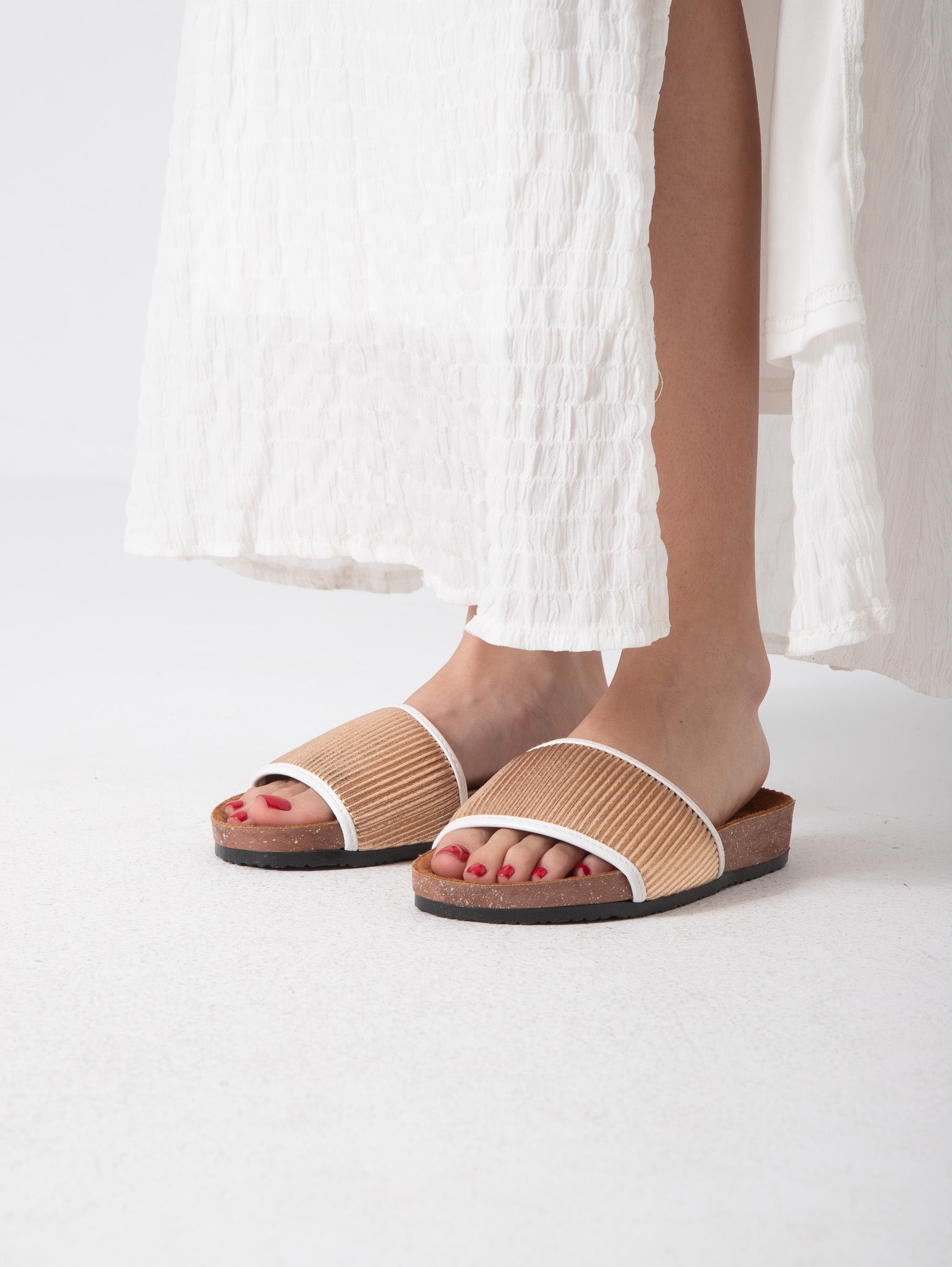 Elevate your style with the Linear Luxe Slide in beige. Crafted with a sleek and modern design, this sandal features a 1-inch heel for added height and comfort. Perfect for any occasion, this slide offers both fashion and functionality. Step into luxury with every step.