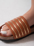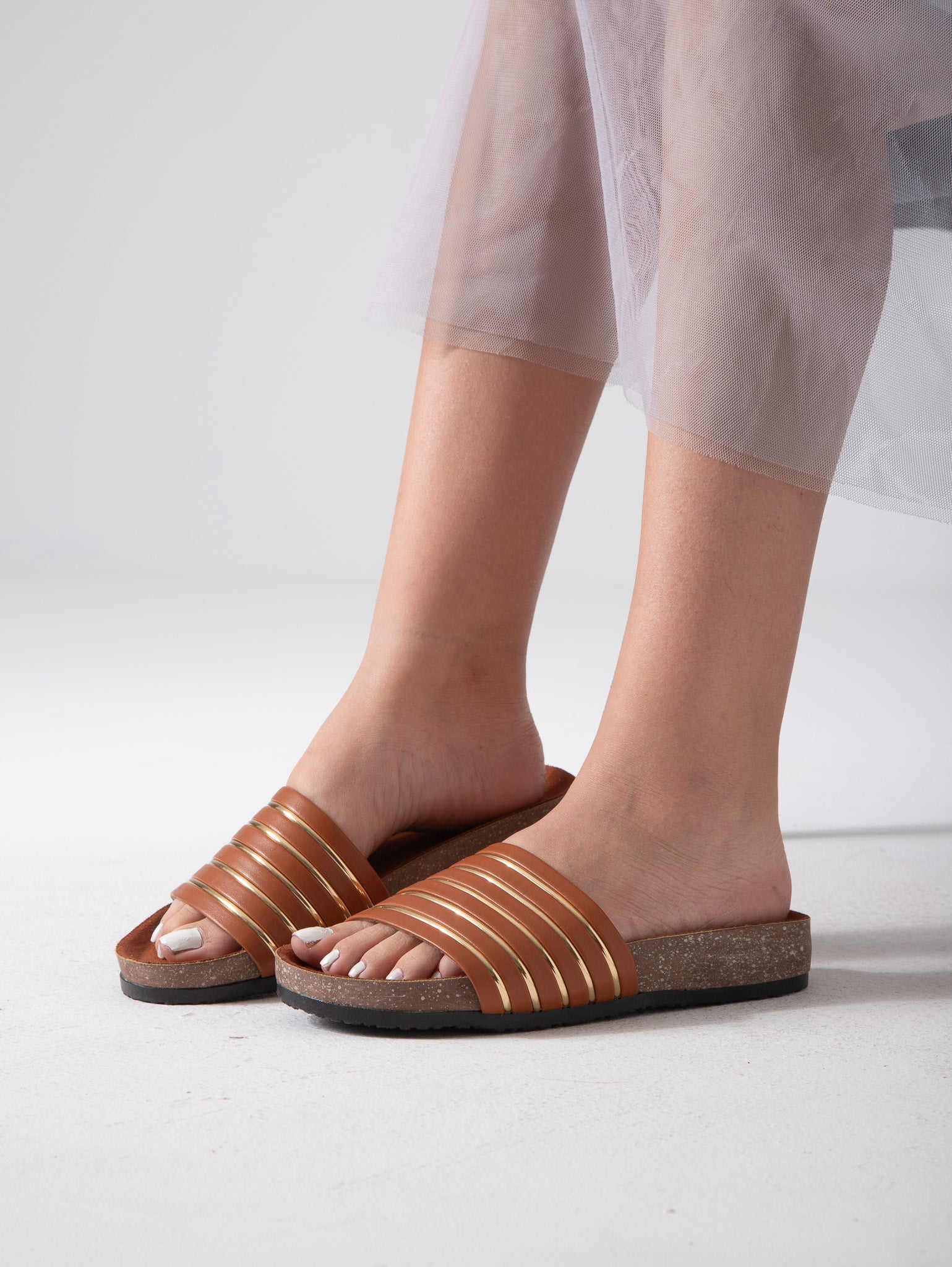 Introducing the Luxe Line Slides in camel. These slides feature a sleek and luxurious design, perfect for adding a touch of sophistication to any outfit. With its comfortable fit and high-quality materials, these slides are the perfect addition to your wardrobe.