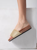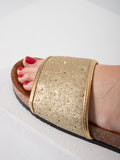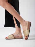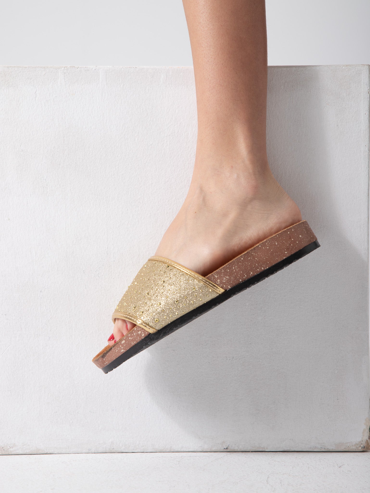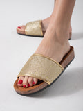 Elevate your casual look with the Sparkle Band Cork Slides in gold. Featuring a comfortable cork sole that provides natural cushioning and support, these slides combine style and practicality. The shimmering gold band adds a refined touch, perfect for both relaxed outings and stylish summer events. Durable and lightweight, they offer all-day comfort without compromising on elegance.