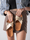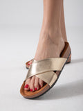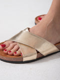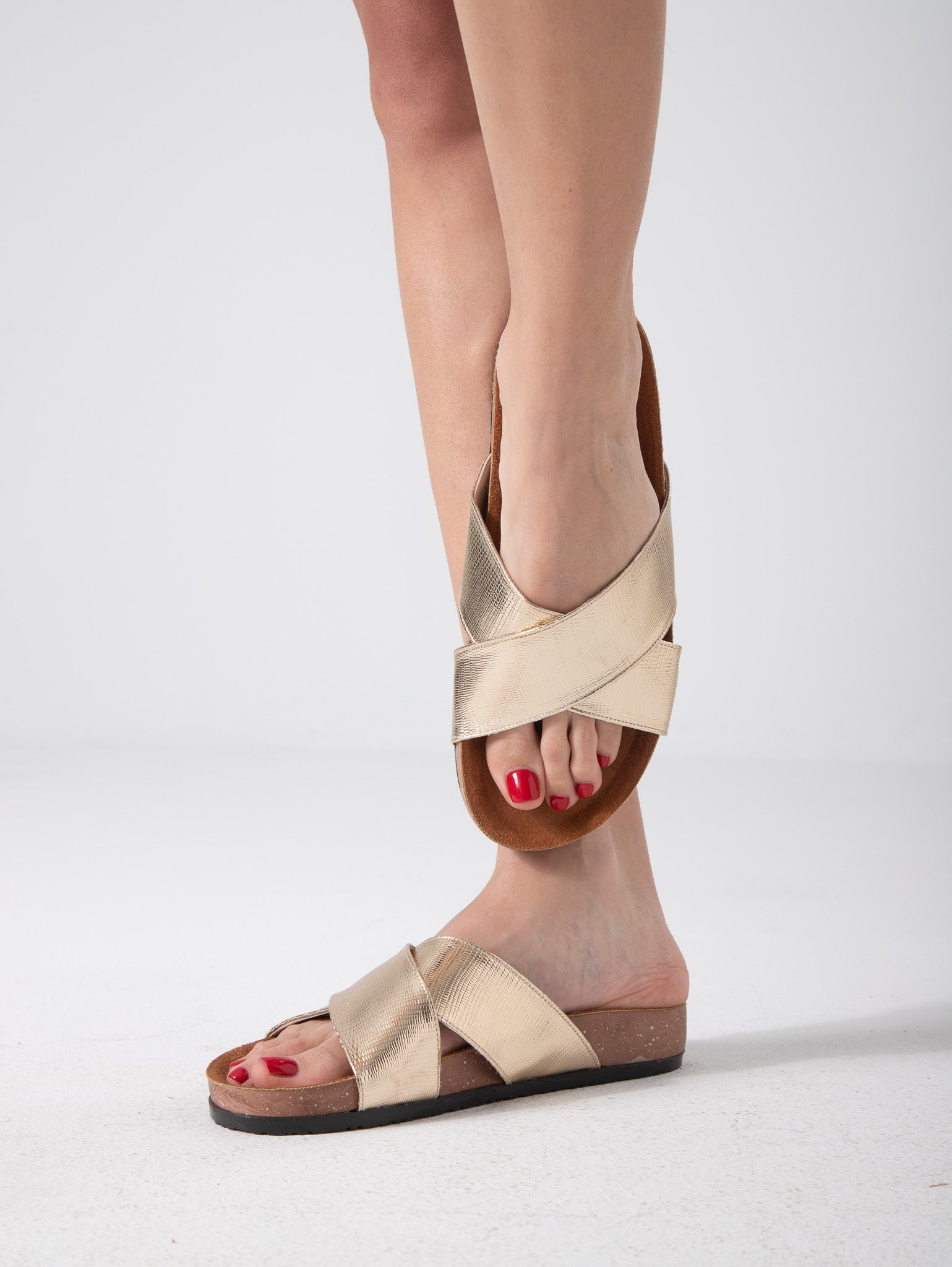 Elevate your style with these gold open-toe sandals featuring elegant cross straps. Designed for both comfort and sophistication, they offer a secure fit while showcasing a chic metallic finish. Perfect for adding a refined touch to any outfit, these sandals combine timeless design with modern appeal.
