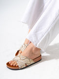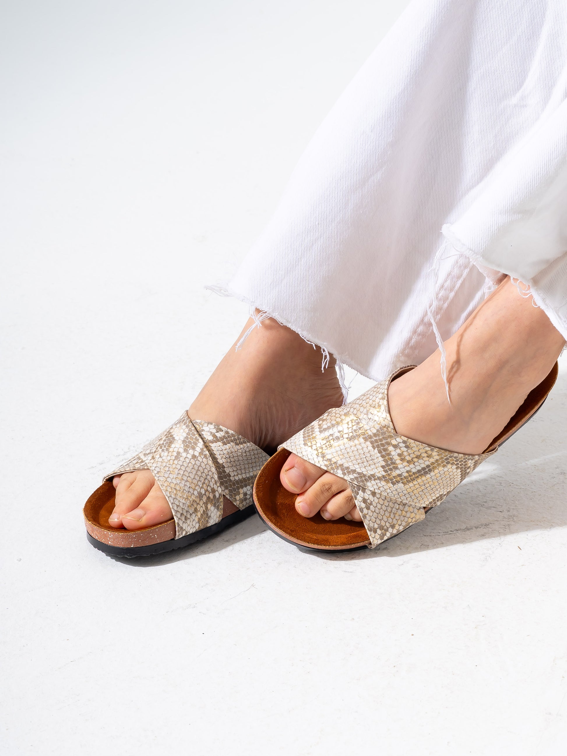 Elevate your footwear collection with this striking metallic animal print cross-strap design. The bold geometric patterns combined with shimmering metallic finishes create an eye-catching statement piece that transitions seamlessly from day to evening wear. The secure cross-strap construction ensures reliable support and comfort, while the distinctive print adds personality to any outfit. Perfect for those who appreciate fashion-forward accessories with both style and substance.