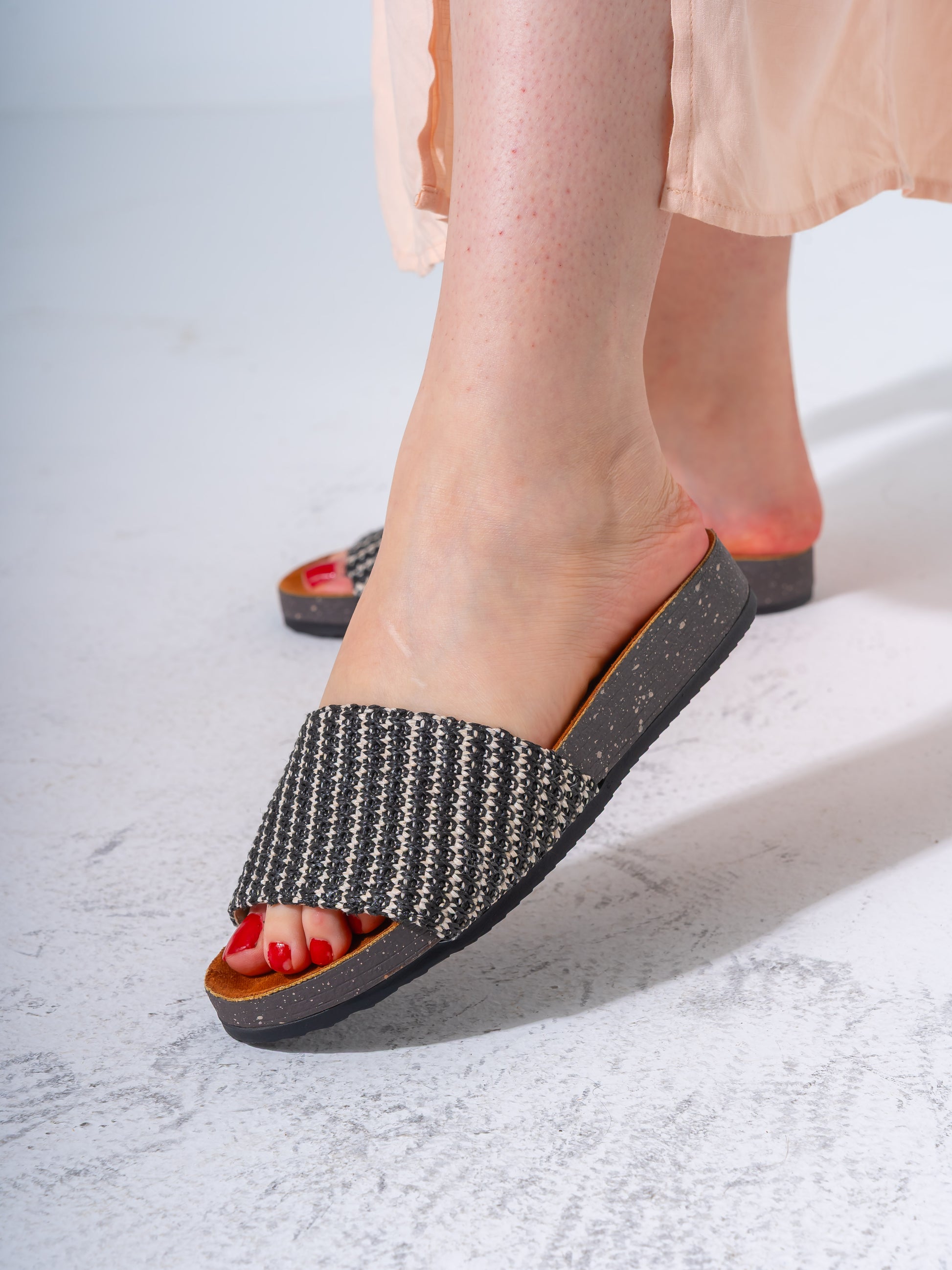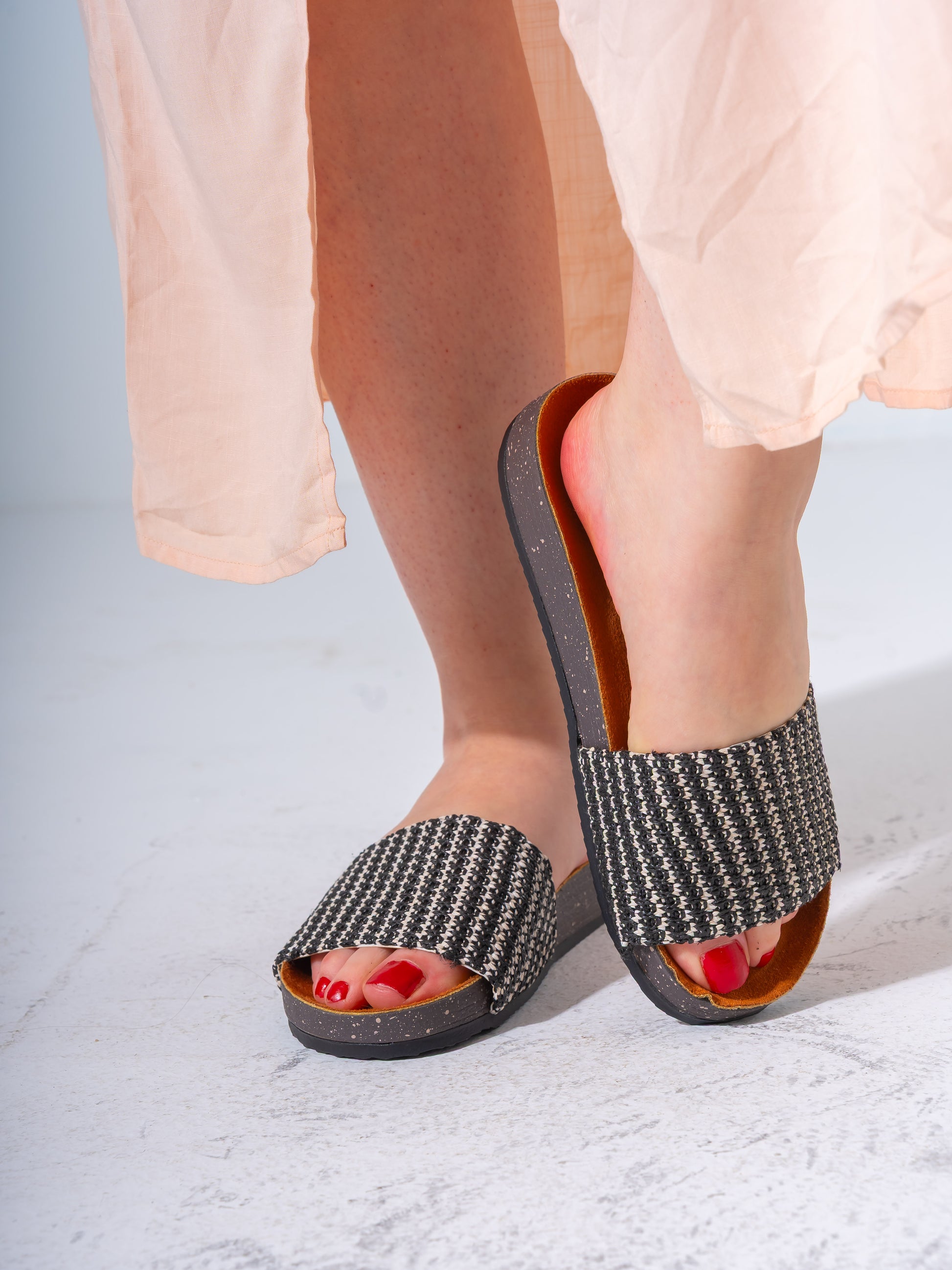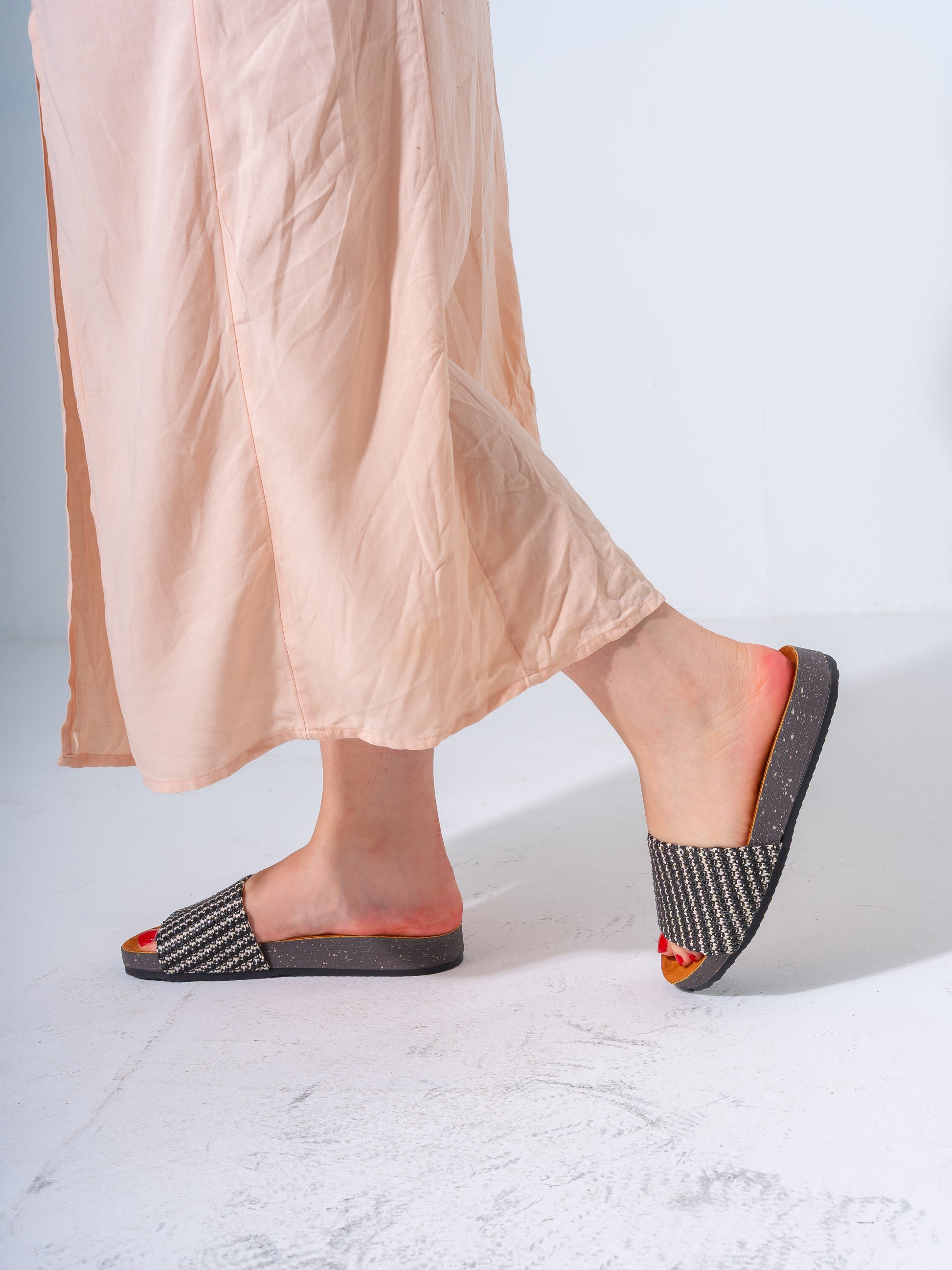 Stylish slip-on sandals featuring a textured woven strap and a cushioned ergonomic footbed for all-day comfort. Perfect for summer outings and beach days.