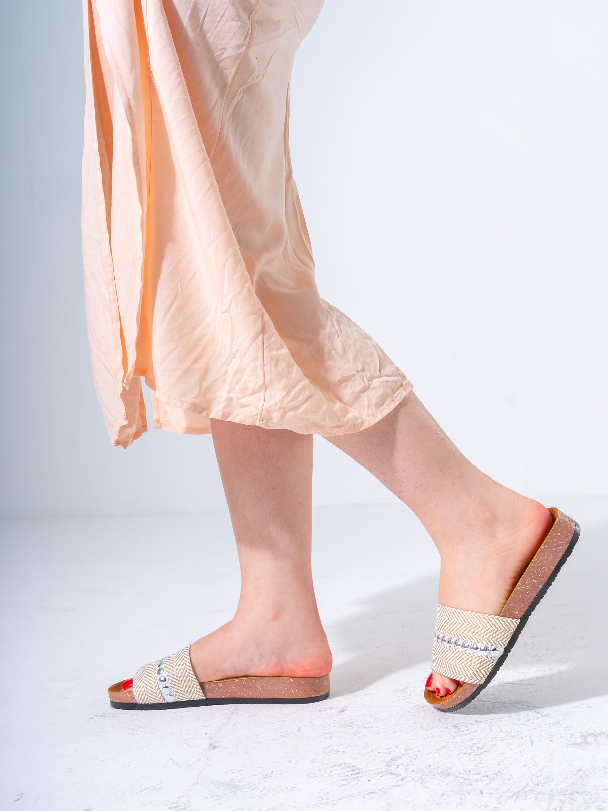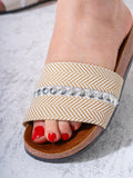 Elevate your casual summer footwear with these sophisticated studded slides. Combining a classic herringbone woven pattern with modern metallic embellishments, these sandals offer a perfect blend of style and ease for your daily adventures.