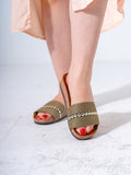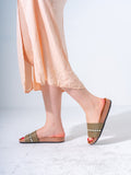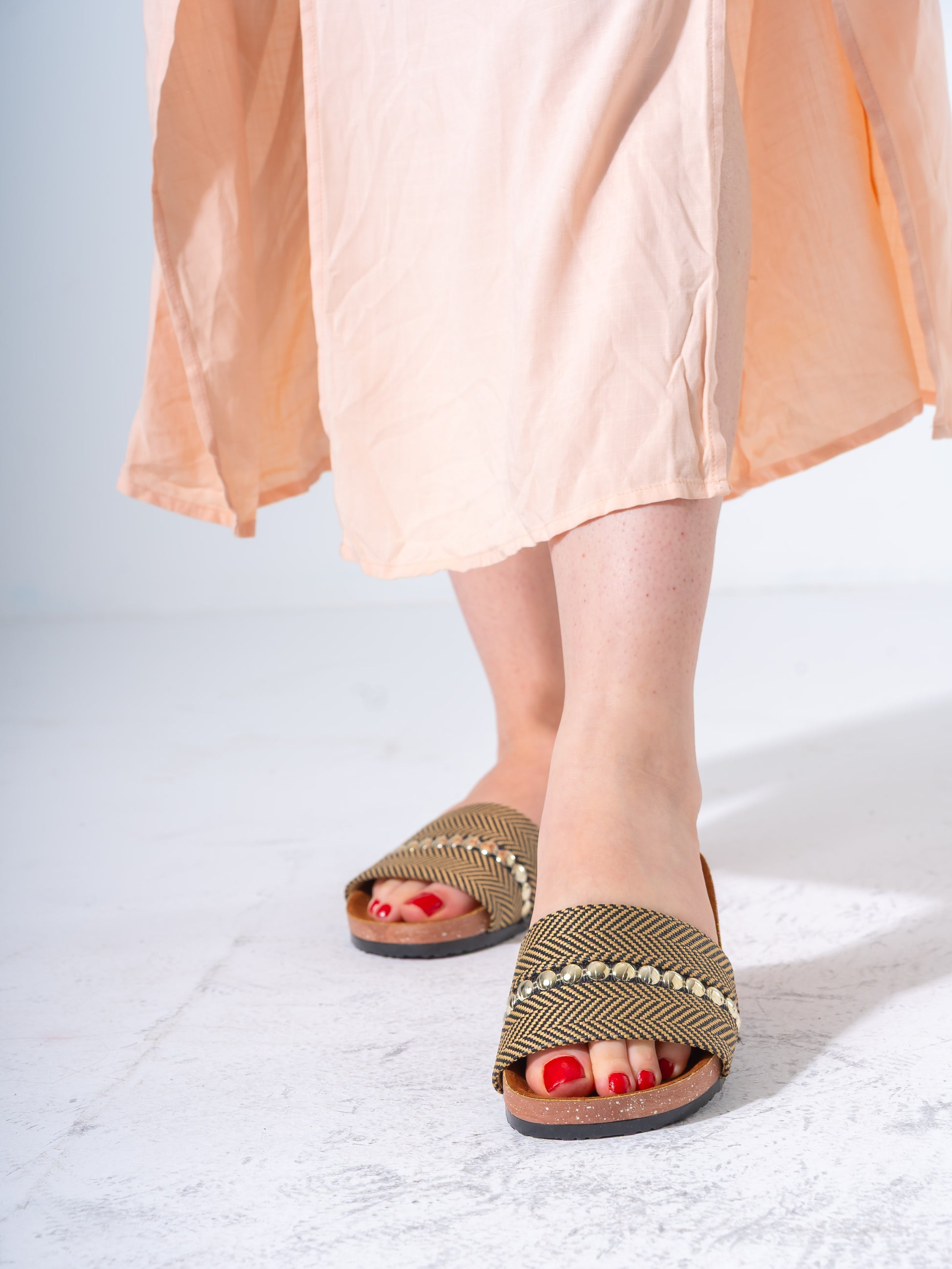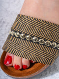 Elevate your casual summer footwear with these sophisticated studded slides. Combining a classic herringbone woven pattern with modern metallic embellishments, these sandals offer a perfect blend of style and ease for your daily adventures.
