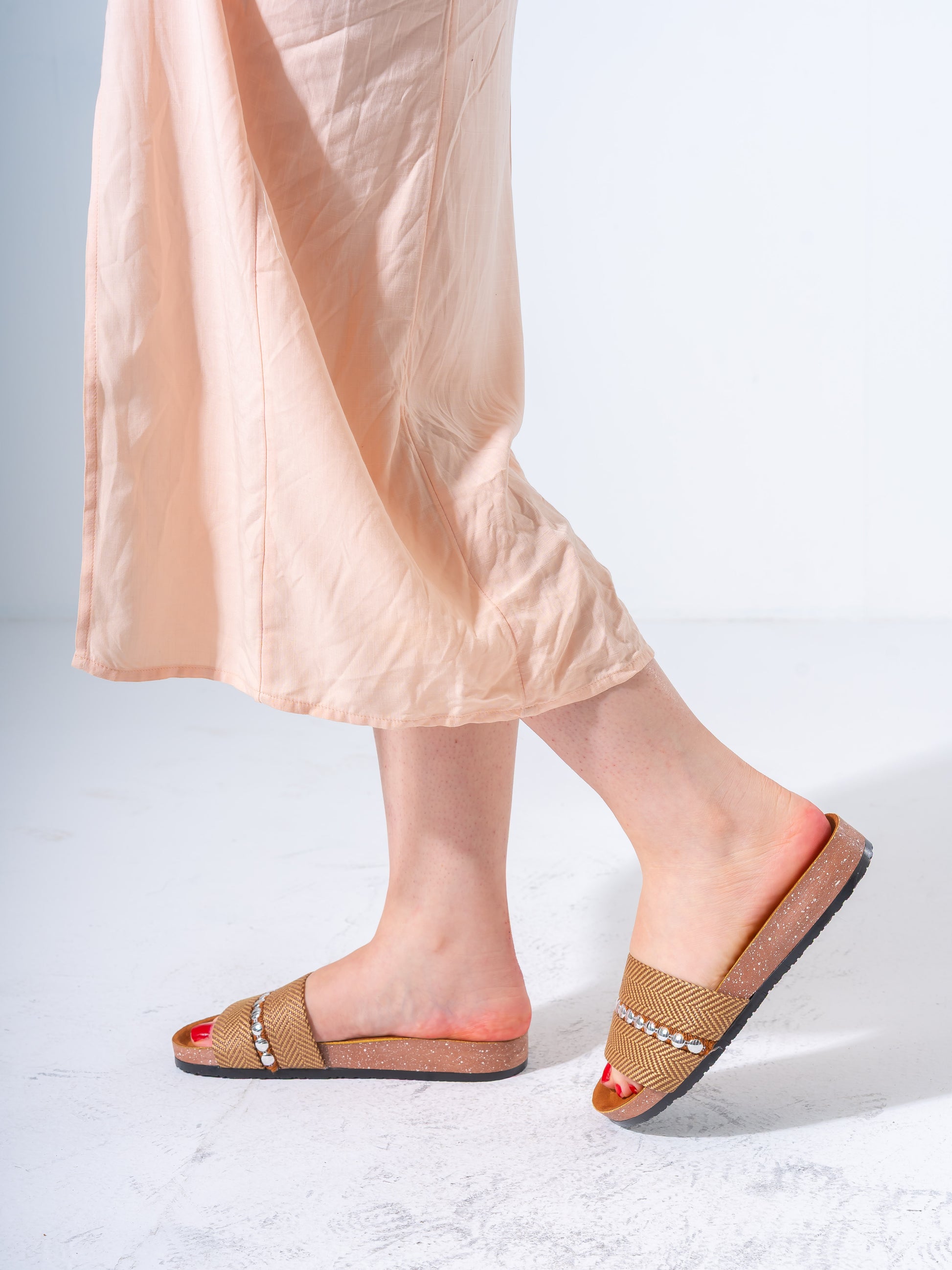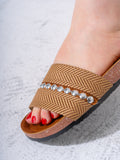 Elevate your casual summer footwear with these sophisticated studded slides. Combining a classic herringbone woven pattern with modern metallic embellishments, these sandals offer a perfect blend of style and ease for your daily adventures.