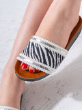 Step into style with these chic woven slides, featuring a striking zebra-patterned strap. Crafted with a textured fabric and accented by shimmering silver sequins, these sandals offer a perfect blend of comfort and glamour. The natural-looking braided edges and contoured sole make them ideal for beach vacations or casual summer outings.