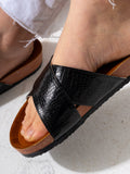 Elevate your casual wardrobe with these chic and versatile slide sandals. Designed with wide, criss-cross straps featuring a sophisticated textured metallic finish, these sandals add a touch of modern flair to any outfit.