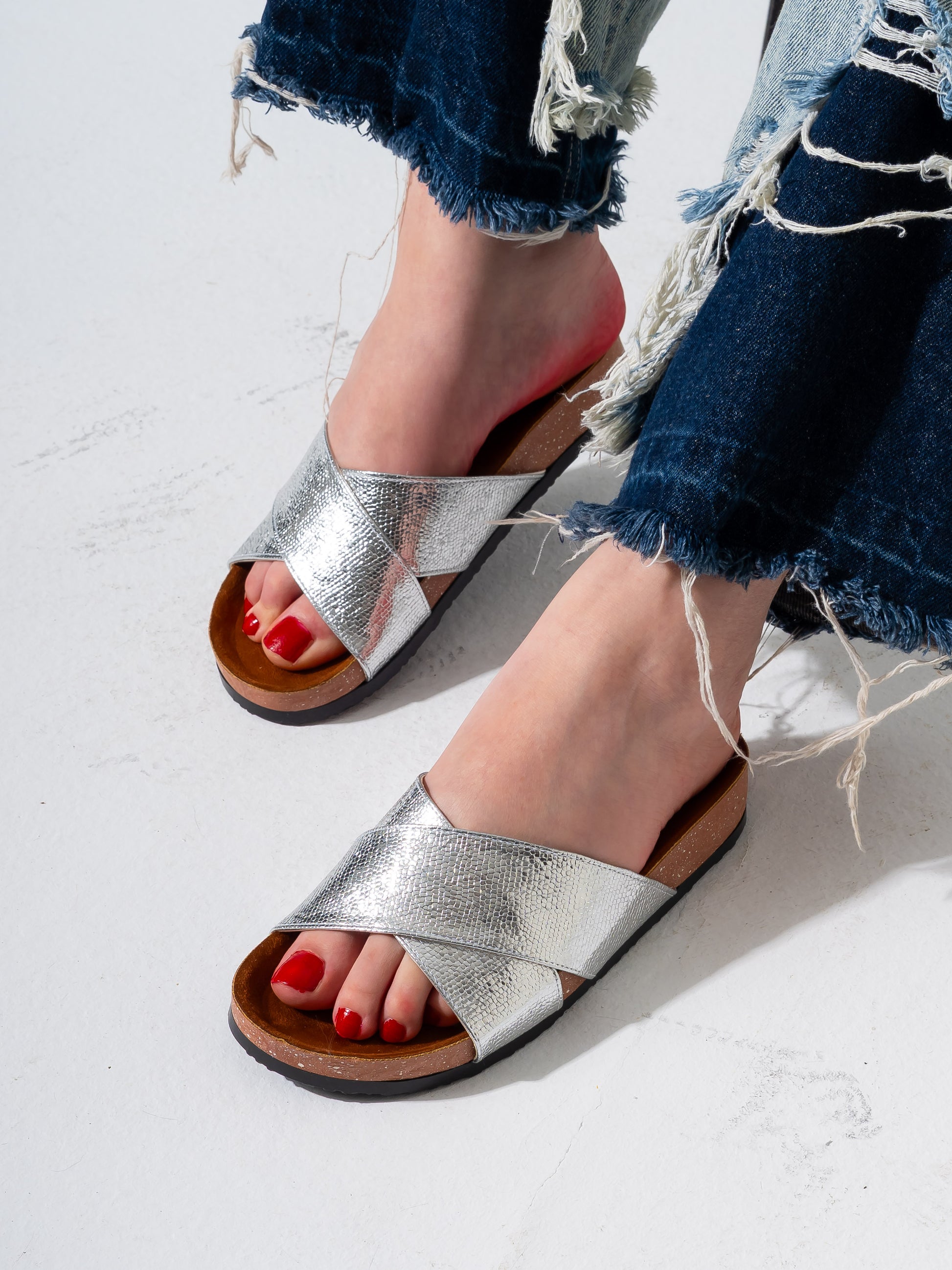 Elevate your casual wardrobe with these chic and versatile slide sandals. Designed with wide, criss-cross straps featuring a sophisticated textured metallic finish, these sandals add a touch of modern flair to any outfit.