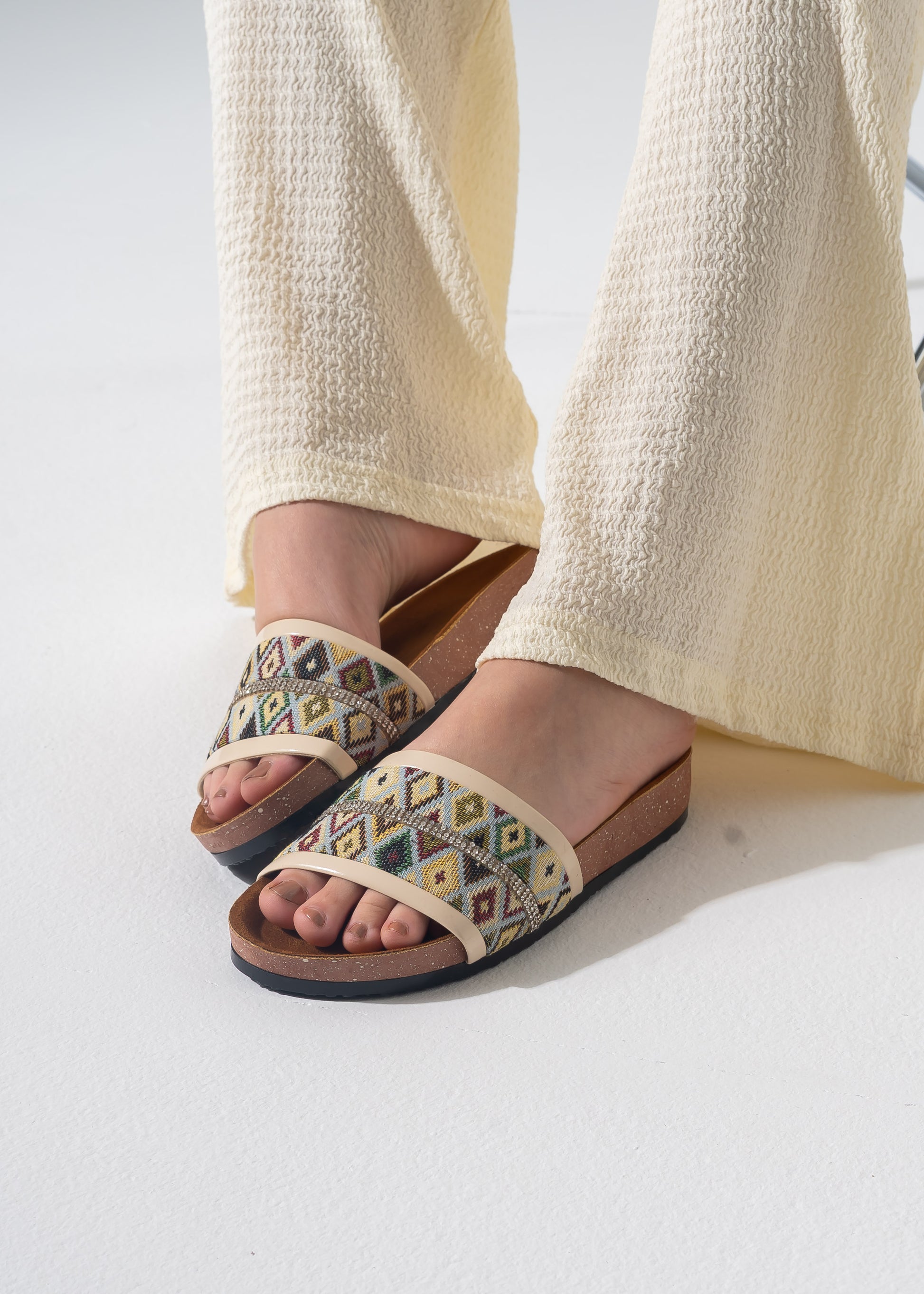 Elegant bohemian-style slides featuring a vibrant woven pattern and shimmering rhinestone accents. Designed with a comfortable contoured footbed for effortless daily wear.