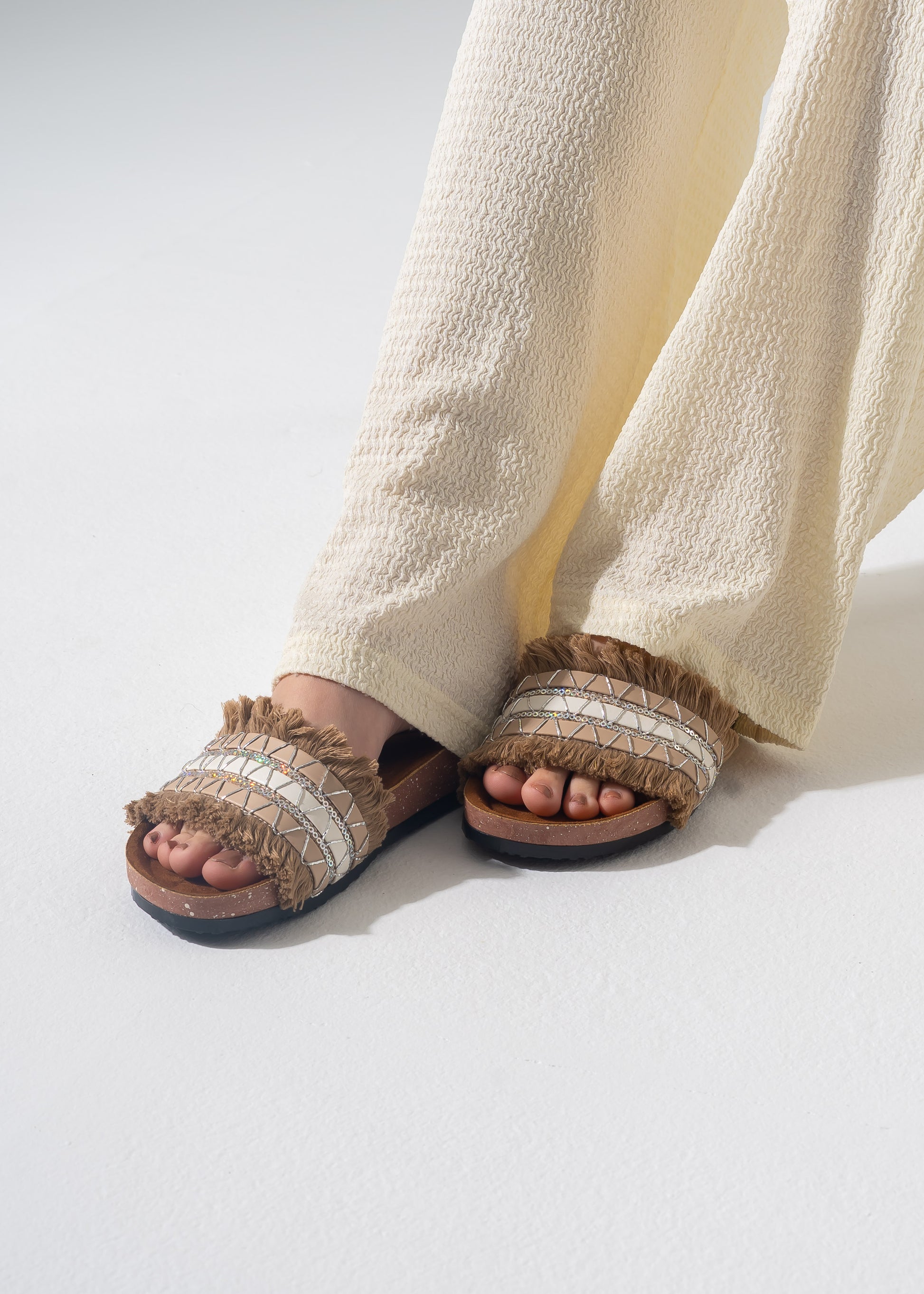 Elevate your casual look with these intricately detailed slides, featuring delicate fringe edges, shimmering sequin accents, and a comfortable ergonomic sole.