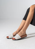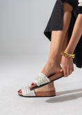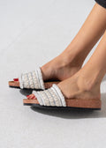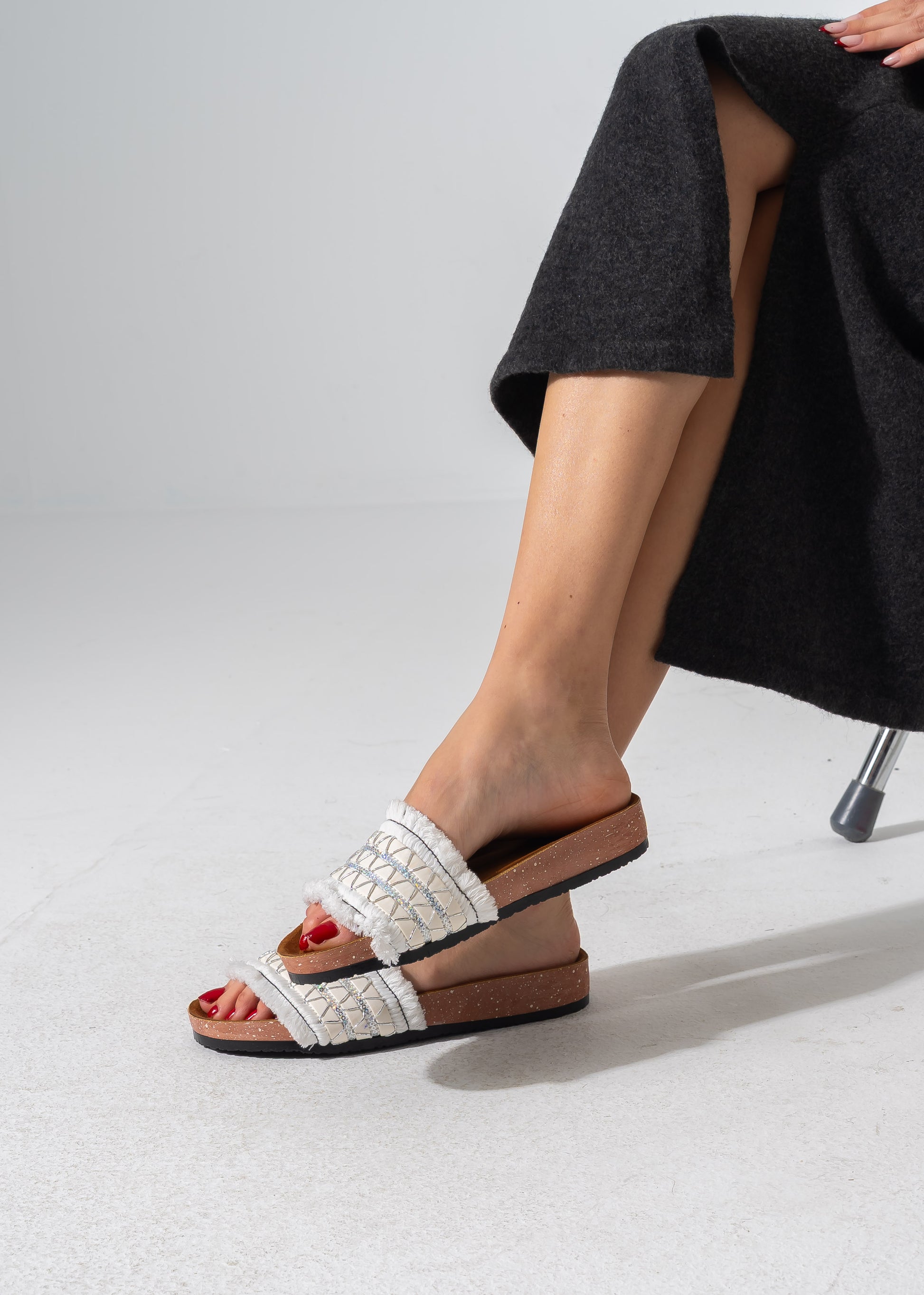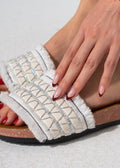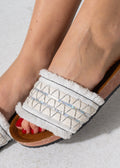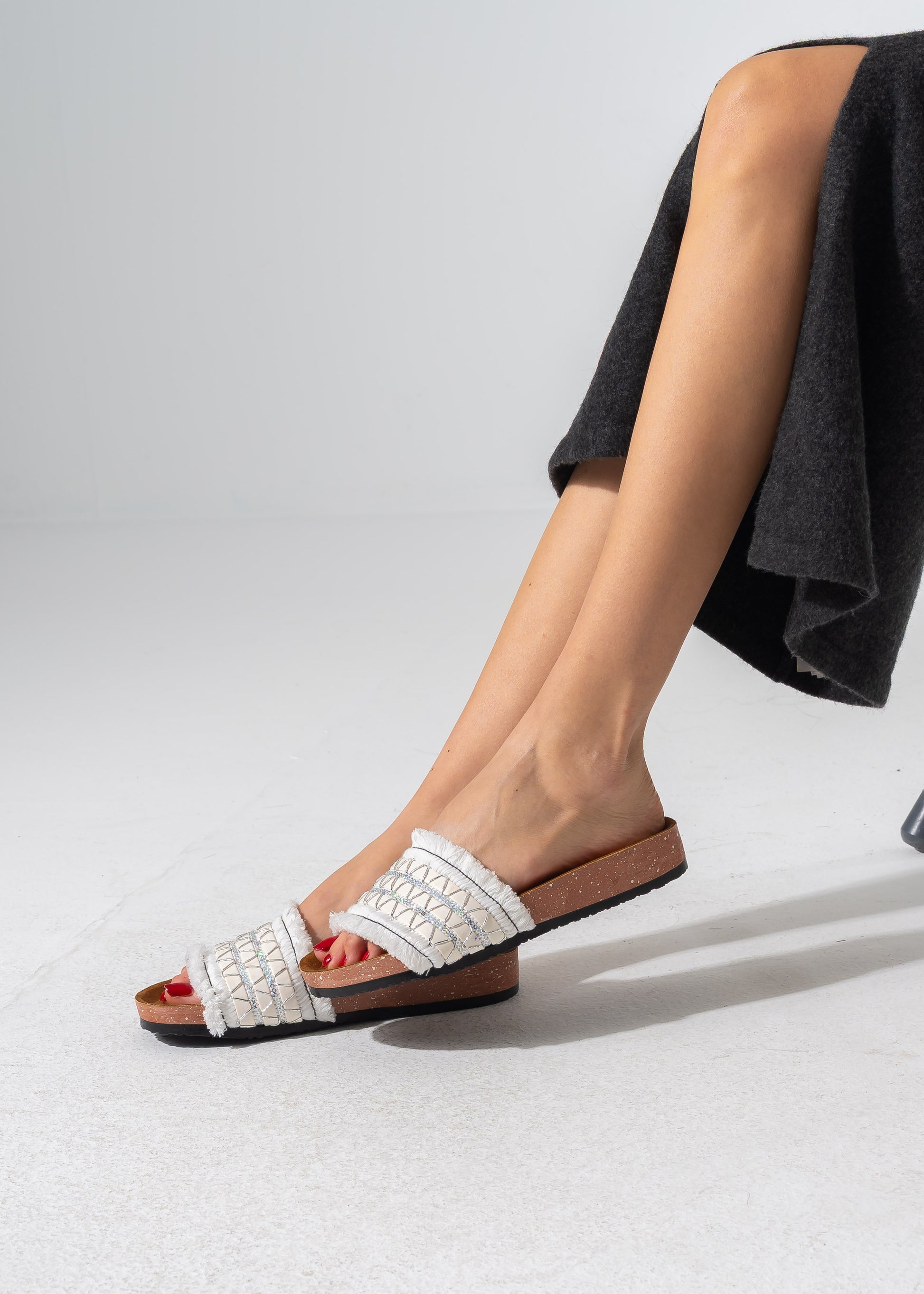 Elevate your casual look with these intricately detailed slides, featuring delicate fringe edges, shimmering sequin accents, and a comfortable ergonomic sole.