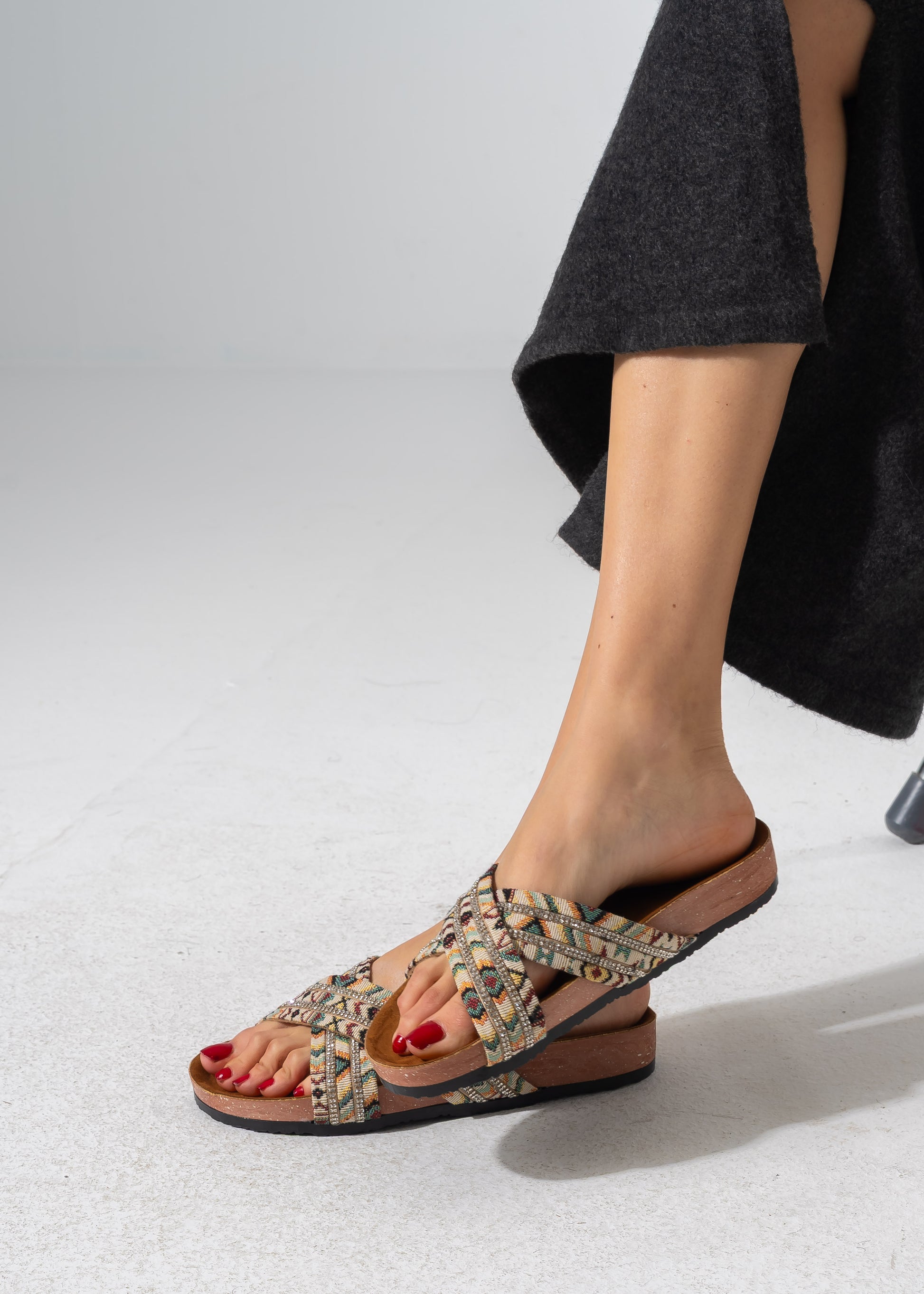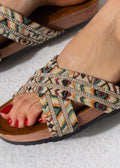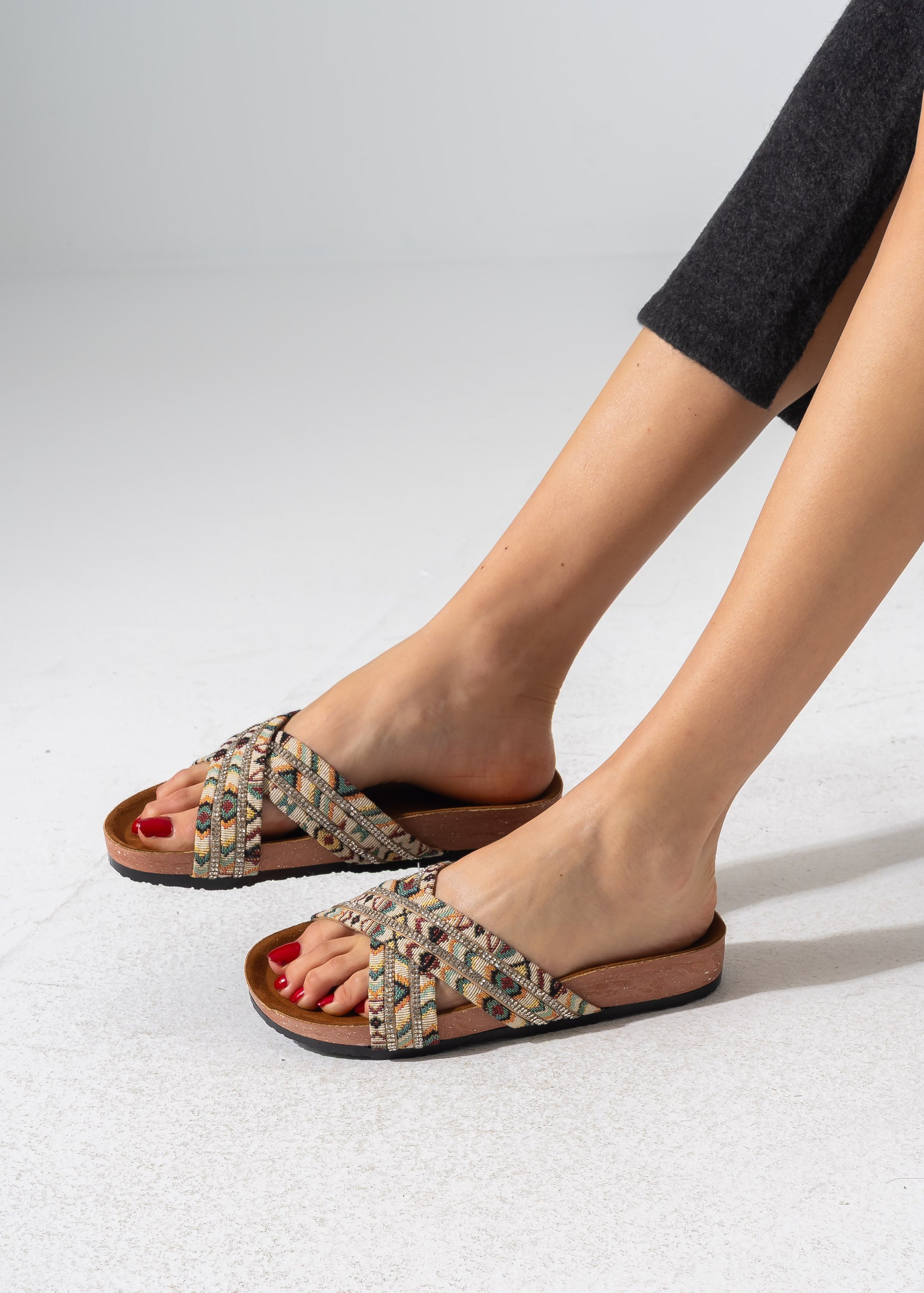 Experience the perfect blend of tradition and sparkle with these criss-cross slides, featuring vibrant ethnic-inspired patterns accented with rows of shimmering crystals for a standout look.