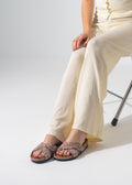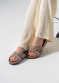 Experience the perfect blend of tradition and sparkle with these criss-cross slides, featuring vibrant ethnic-inspired patterns accented with rows of shimmering crystals for a standout look.