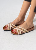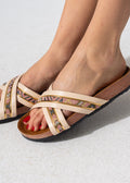 Step into effortless style with these chic criss-cross slides. Designed with a blend of vibrant ethnic textiles, shimmering metallic textures, and sparkling crystal accents on a comfortable contoured sole.