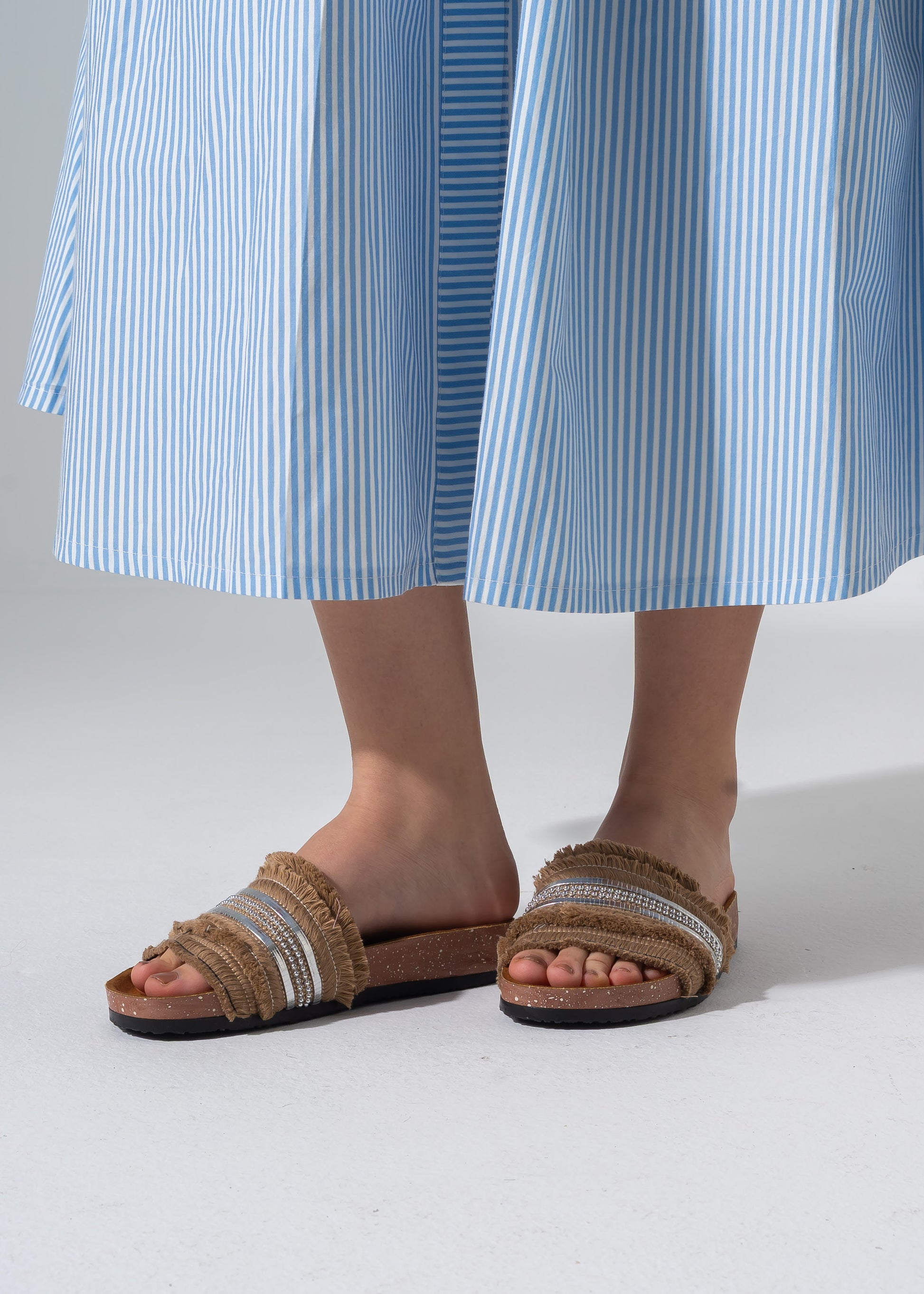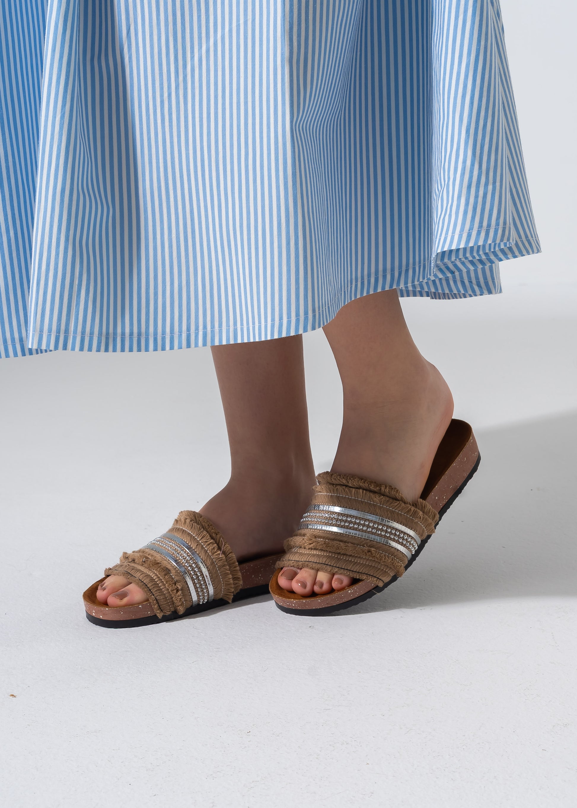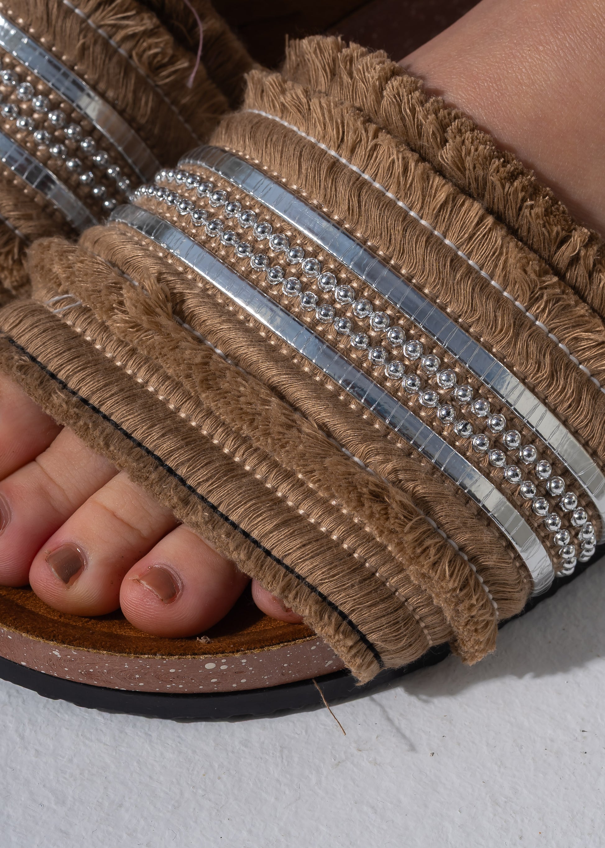 Step into effortless style with our Fringe Bead Sliders. Featuring a trendy frayed fabric strap adorned with shimmering metallic beads, these slides combine a boho-chic vibe with everyday comfort. The contoured cork-style footbed ensures a perfect fit for all-day wear.