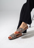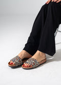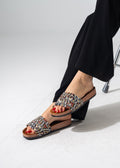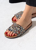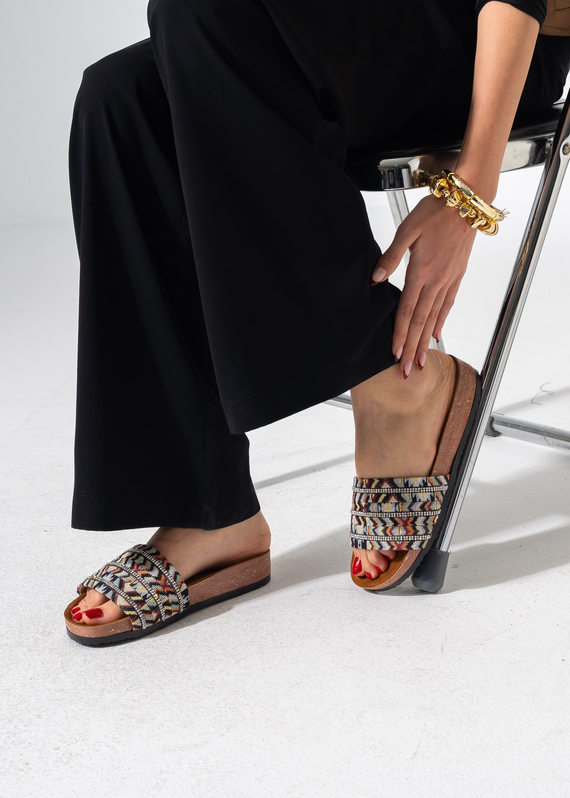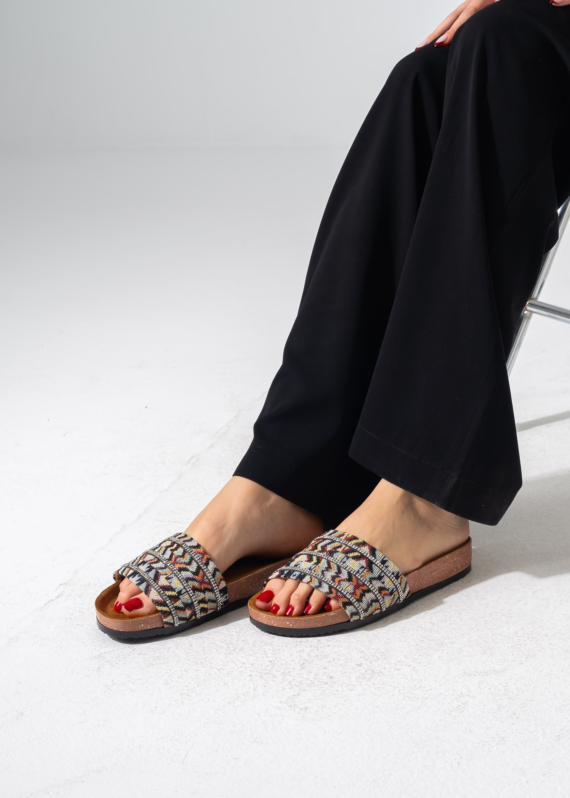 Elevate your casual look with these chic slides featuring a vibrant ethnic-inspired textile upper, beautifully accented with rows of shimmering crystals on a comfortable cork-style sole.