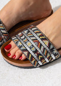 Make a statement with our Festival Glam Slides, where traditional artistry meets modern sparkle. These sandals feature a beautifully woven tapestry-style strap, highlighted by rows of shimmering sequins that catch the light with every move. Built on a contoured comfort sole, they are the perfect companion for beach vacations, music festivals, or adding a vibrant touch to your daily look.