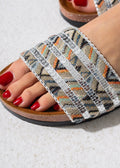 Make a statement with our Festival Glam Slides, where traditional artistry meets modern sparkle. These sandals feature a beautifully woven tapestry-style strap, highlighted by rows of shimmering sequins that catch the light with every move. Built on a contoured comfort sole, they are the perfect companion for beach vacations, music festivals, or adding a vibrant touch to your daily look.